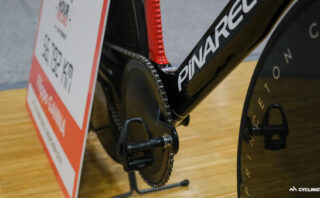 アワーレコードはあらゆる抵抗との戦いだ。特に空気抵抗や摩擦抵抗を低減することに関しては、現状考えられる最高の機材が投入されている。フレームはピナレロのプロトタイプで、いまだ謎に包まれた断面変動を備えたフレームだ。