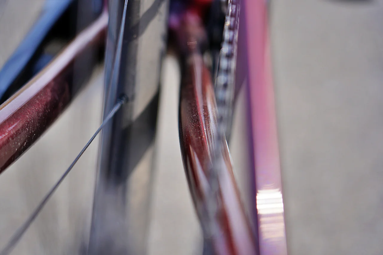 ダウンチューブを拭き上げるときに、BB側を握ってトップチューブ側にスライドしていくとだんだん太くなる形状であることがわかる。BB側はチューブが細く、ヘッドチューブ側は太くなっている。ピーター氏の設計、Aethosと同様だ。