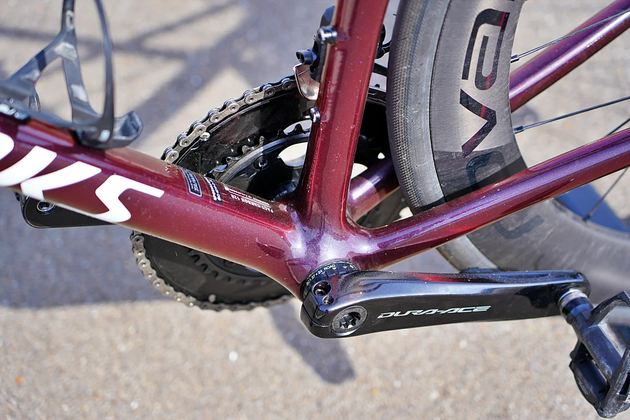 「BBがマッシブ」なんて言葉をメディアでみかけることがあるが、SL8のBB周りは心配になるほど細身だ。ピーター氏の設計思想から言わせると「意味のない太さ」なのかもしれない。
