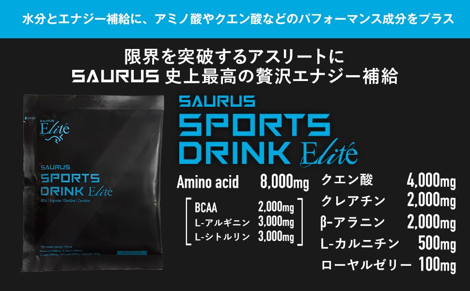 限界を突破するアスリートのために開発されたドリンクは、サウルス史上最高の成分を含んでいる。水分やエネルギー補給に加えて、エビデンスレベルが高いエルゴジェニックエイド成分をドリンクとして簡単に摂取できる。