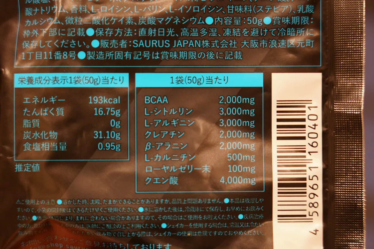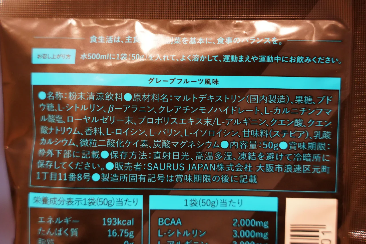 このドリンクには、β-アラニン、クレアチン、アミノ酸などパフォーマンスを高める成分が合計16,600mg配合されている。アスリートが求めるエネルギーとパフォーマンス成分を網羅した、唯一無二のスペシャルドリンクだ。