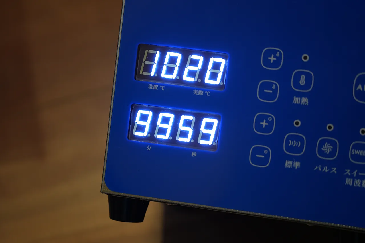 更に洗浄力を上げたい方は、溶剤を加熱する機能も備わっている。高精度の加熱装置を採用しており、サーモスタットシステムに合わせて、液体の温度を正確に計測する。本体前面には、『設定温度』『現在の温度』の2つが表示される。