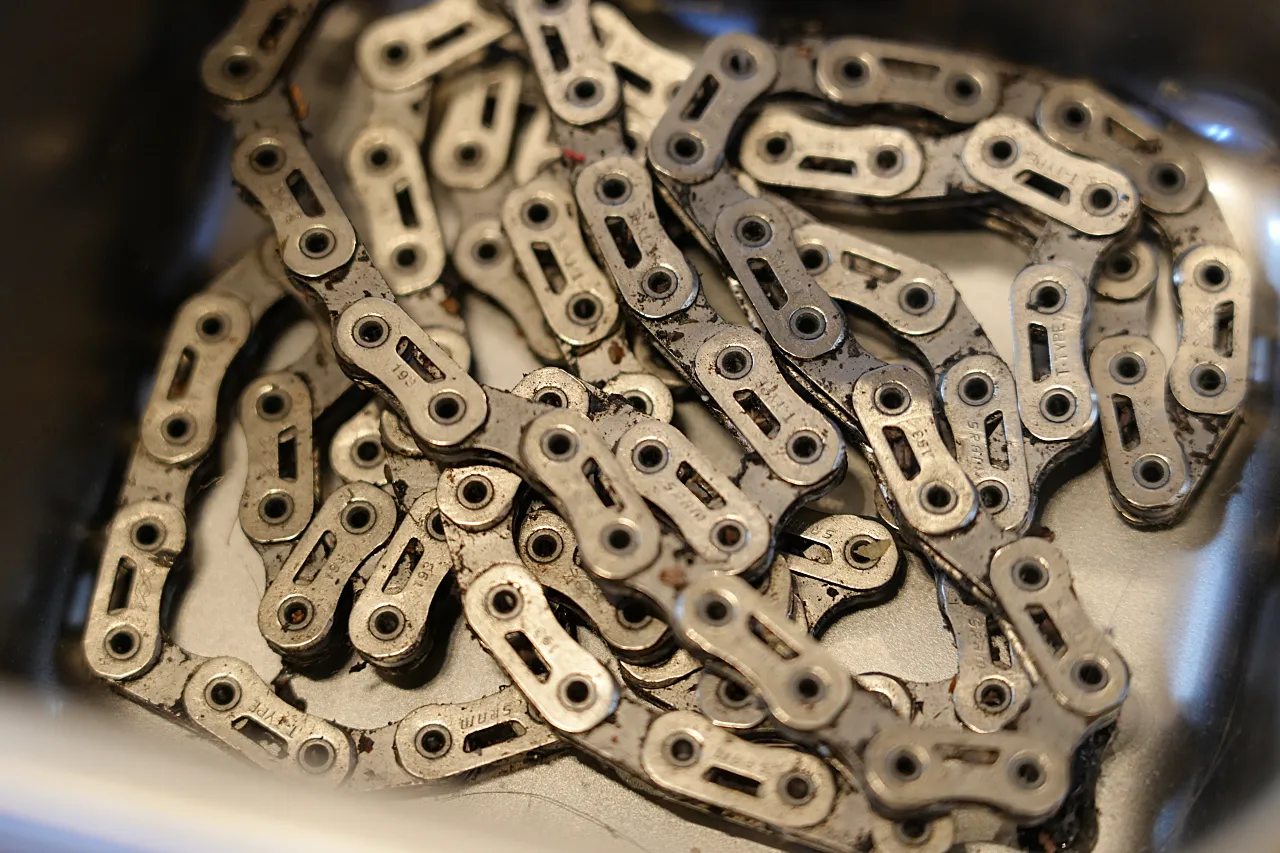 超音波洗浄機をチェーン洗浄で使っていたが、メガネや時計用で最も普及している40kHzタイプを用いていた。この周波数でも十分なのだが、業務用の強力な28kHzタイプを用いると更に汚れが落ちる。