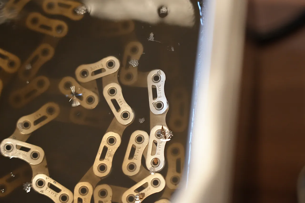 28kHzと40kHzを交互に発生させてみたところ、溶剤を加熱せずとも汚れがどんどんおちていく。0.02~0.016mmの超微細な泡が、チェーン内部の汚れに衝撃を与えかき出してくれる。ブラシでは決して取れないような汚れもかき出してくれるようだ。