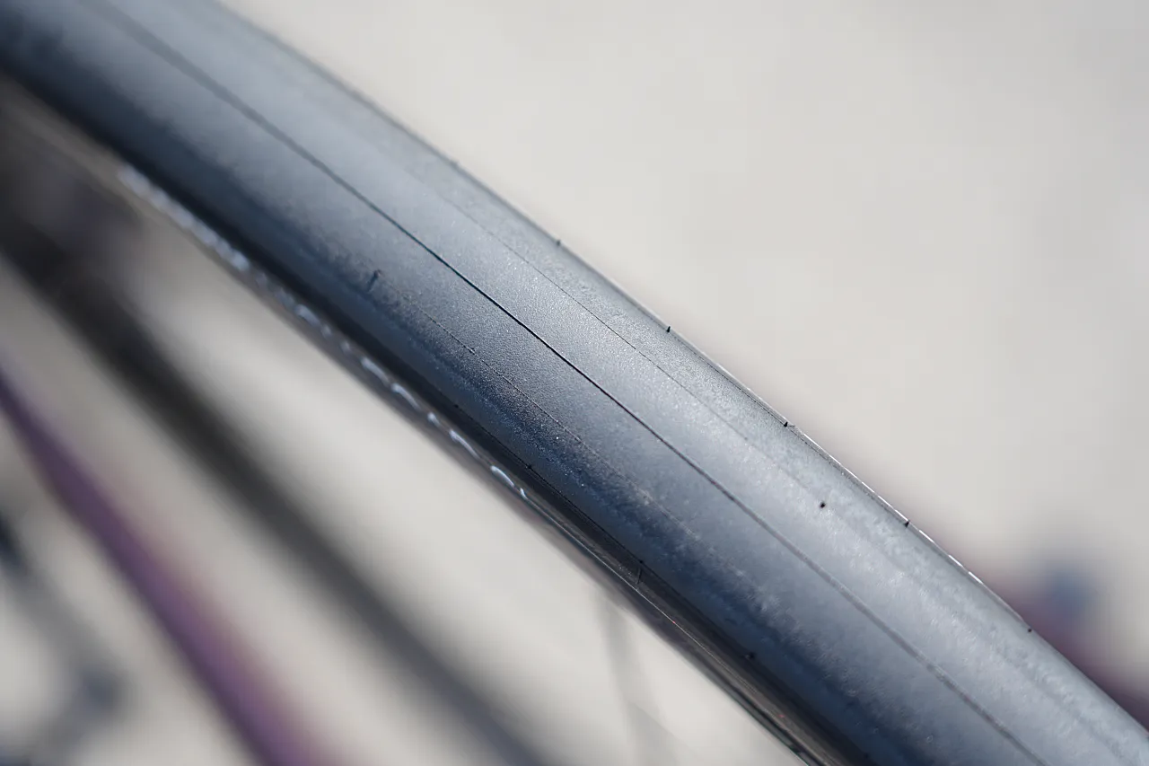面白いことに、実走での走りの質、硬質さがGP5000と似ている。軽量タイヤでイメージするようなペラペラ感がなく、どちらかといえばGP5000系の硬い感触そのままだ。28Cとトレッドの薄さ、エアボリュームによる振動減衰の性能も感じられる。