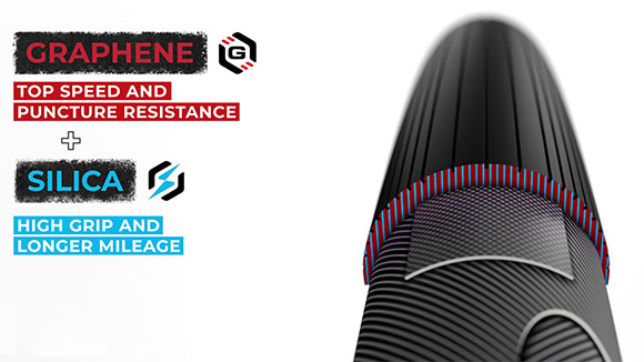 Vittoriaによれば、グラフェンは転がり抵抗の削減、グリップ力の向上、そして耐摩耗性の向上に寄与する。一方、シリカは特にウェットコンディションでのグリップ性能とタイヤ全体の耐久性をさらに高める効果があるとされる。