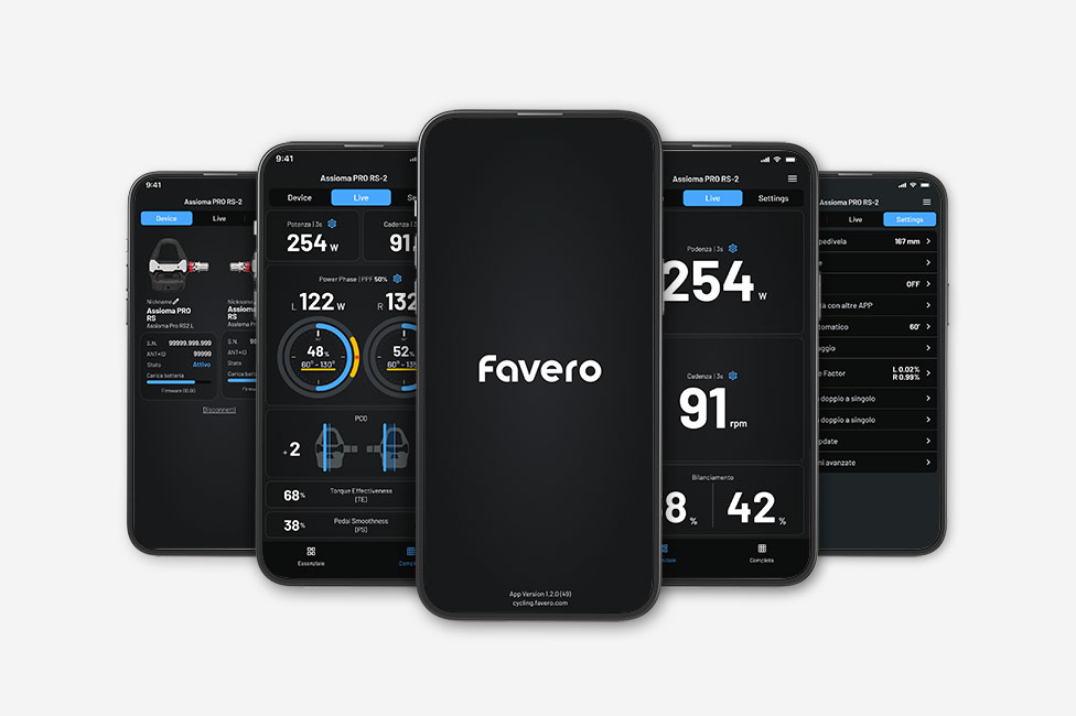 Favero Assioma専用スマートフォンアプリケーション(iOSおよびAndroid対応)は、Assioma PRO RSのセットアップ、管理、そして一部の高度な機能を利用するための重要なツールだ。