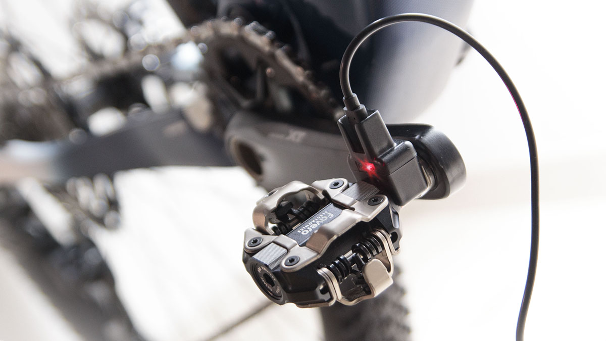 充電は、ペダルスピンドル端に設けられた接点に専用の磁気コネクタを接続して行う。この磁気コネクタは、確実な接続と容易な着脱を両立し、万が一ケーブルに不意な力が加わった場合でも、ペダル本体やコネクタの破損リスクを低減する設計となっている。