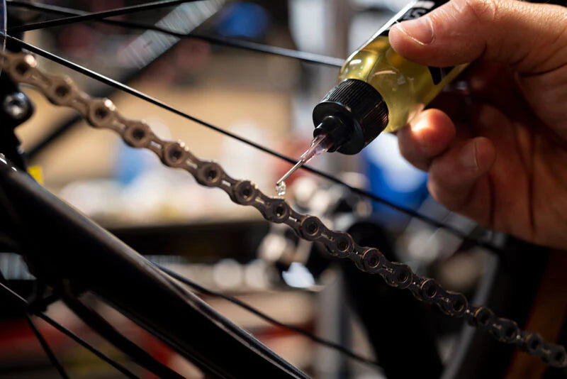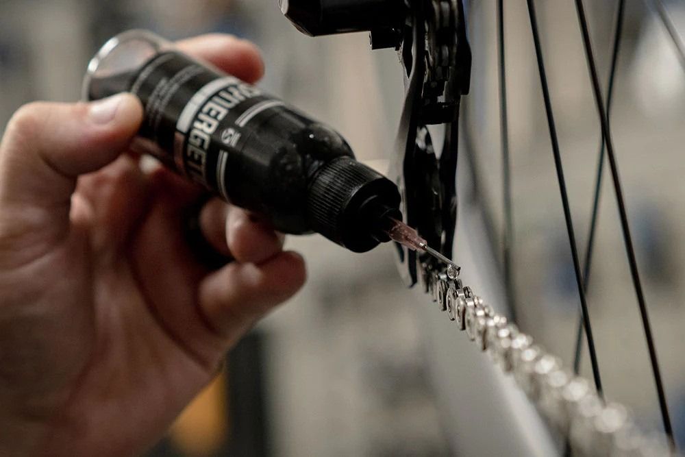 各ローラーの隙間に1滴ずつ(ローラーあたり2滴)塗布し、クランクを逆回転させて潤滑剤をチェーン内部に浸透させる(例:10~12回転)。塗布後、チェーン外側の余分な潤滑剤はマイクロファイバークロスなどで可能な限り拭き取ることが重要だ。塗布後の硬化時間は不要である。
