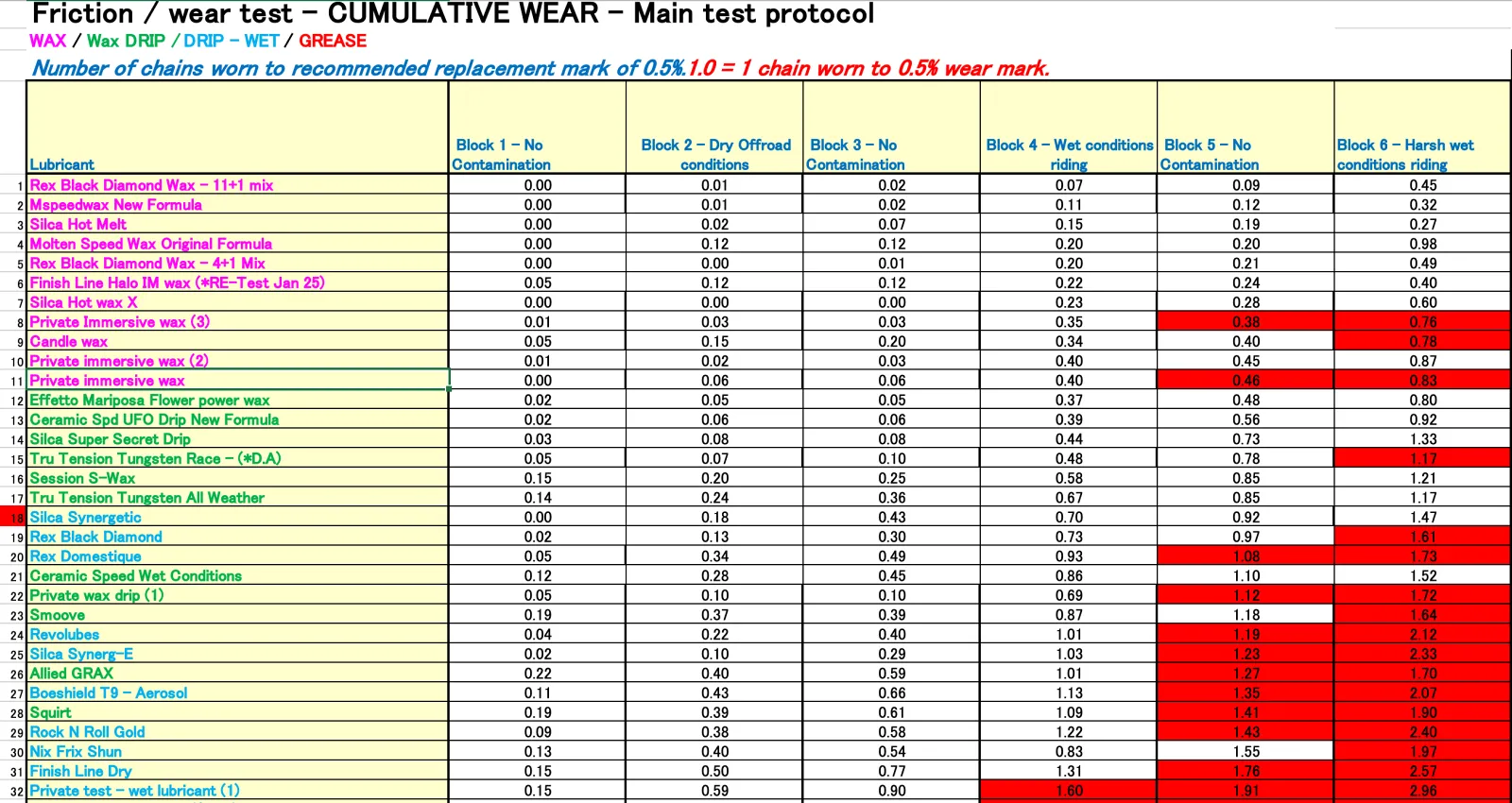 この表は潤滑性能が高い順番に並んでいる。上位は全てピンク色のスロークッカーを使用したMolten Speed Wax New Formulaに代表されるWAX系が占めている。