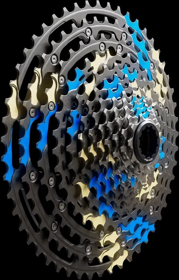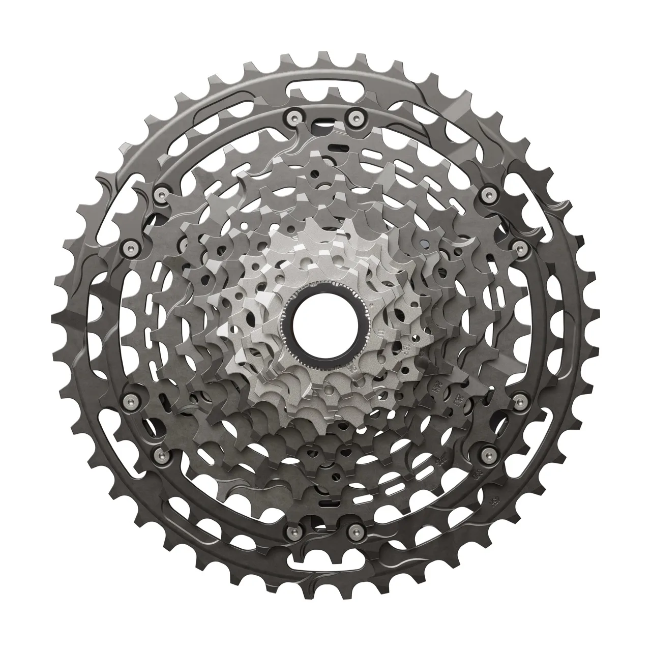 9-45Tではロー側2枚がアルミニウム、続く5枚がチタン、トップ側5枚がスチールとなる。スパイダーアームはアルミニウム製である。素材のハイブリッド構成はXTRカセットの伝統であるが、M9200ではその配分や細部の設計に手が加えられている。