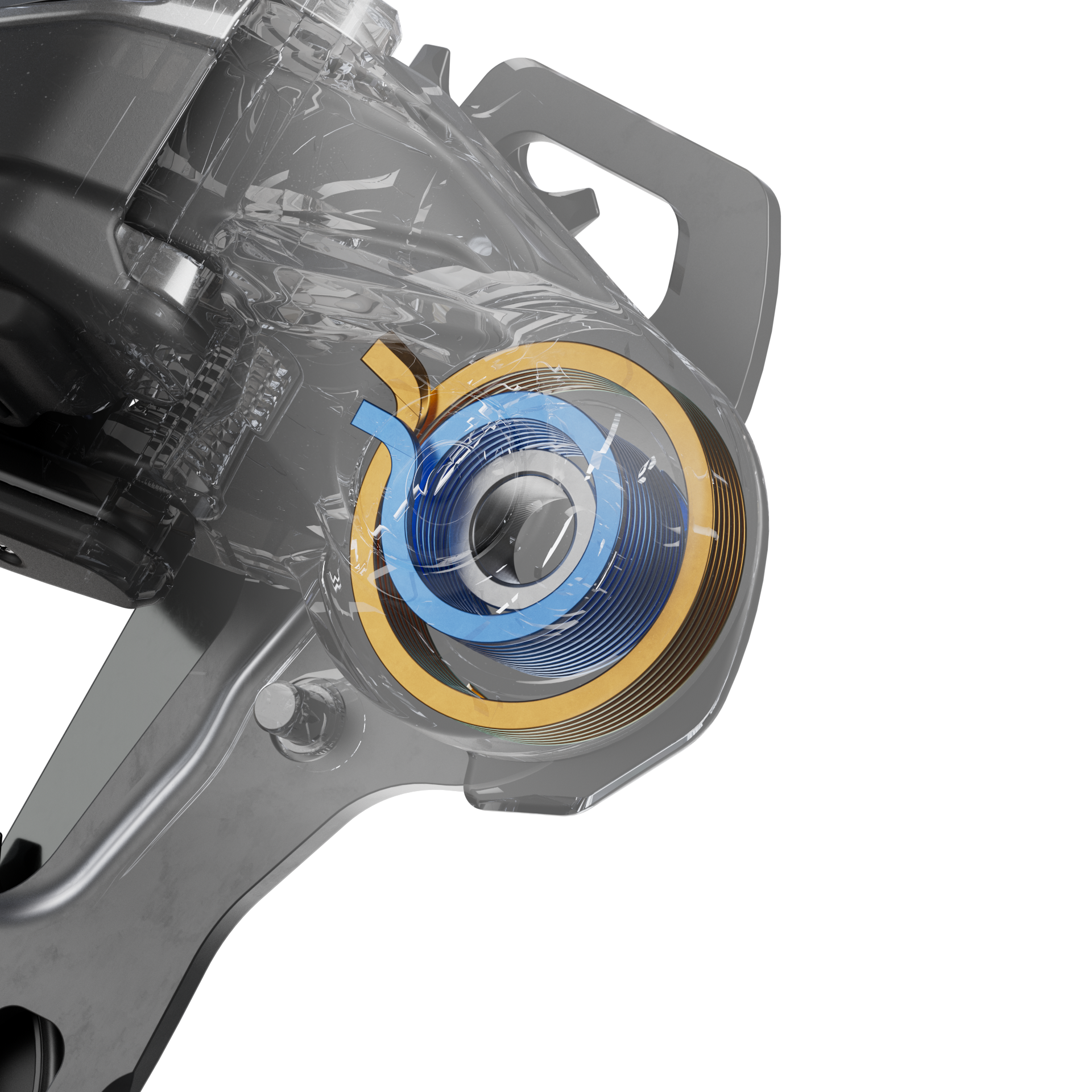 - 向上した堅牢性と信頼性:SHADOW ESデザインと自動衝撃回復機能により、ディレイラーの耐衝撃性が大幅に向上。新しいデュアルスプリングスタビライザーはメンテナンスフリーで高いチェーン保持力を提供。