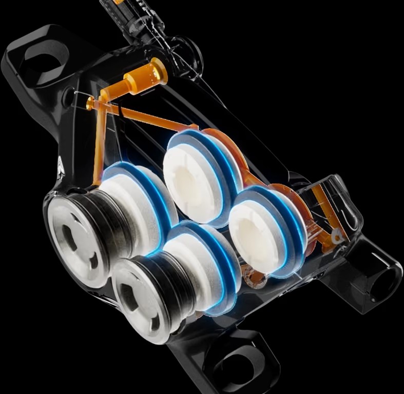 対向2ピストン設計は、XCレースに必要な十分な制動力を確保しつつ、システム全体の軽量化に大きく貢献する。キャリパーボディの素材にはマグネシウムが使用されることもあり、さらなる軽量化が追求されている。