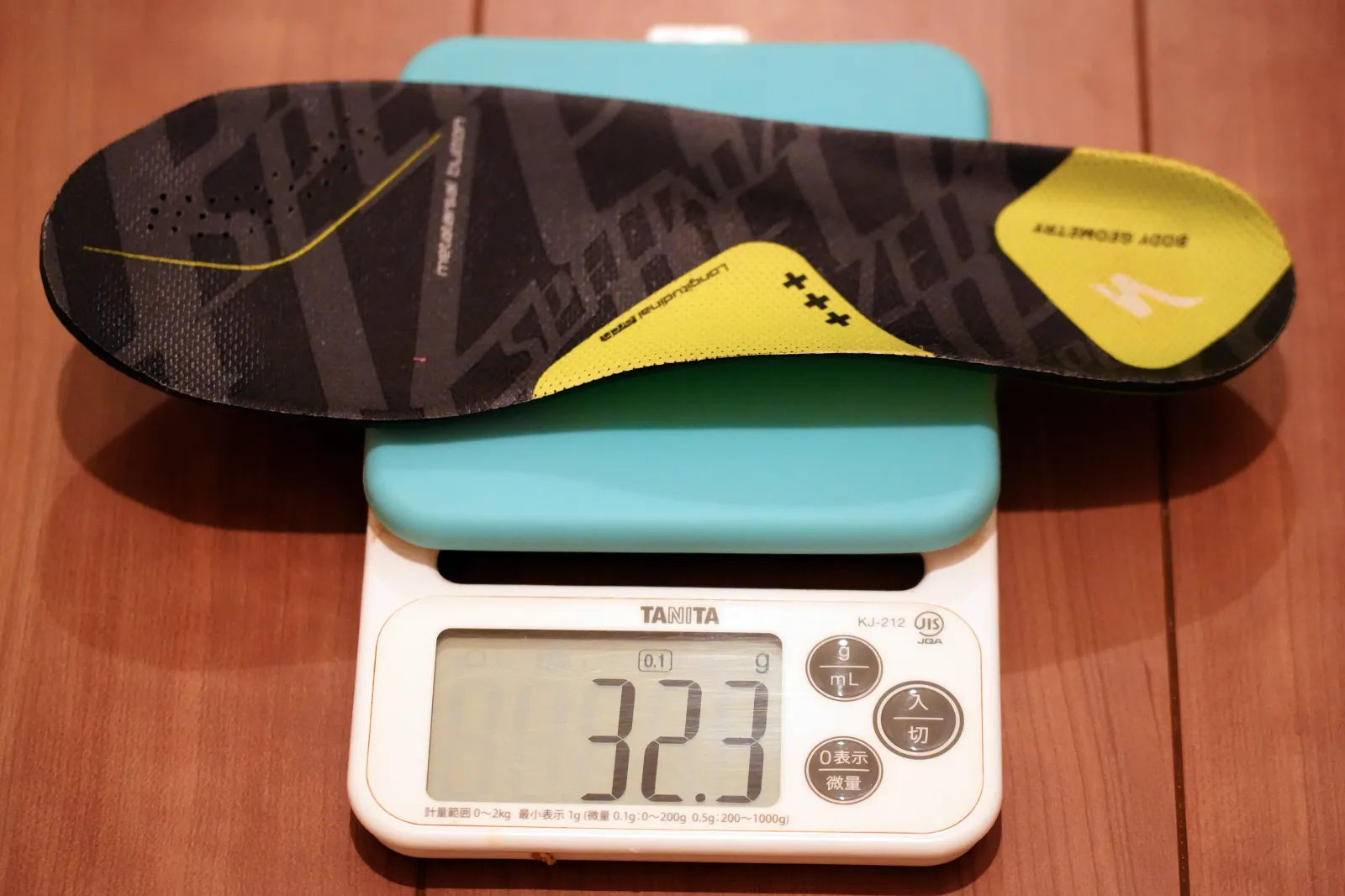 Body Geometry SLフットベッド Gen 2の重量はサイズ40-41で実測重量が32gであった。これはサイクリング用インソールとしては極めて軽量な部類に入り、特に重量を重視するエリートレベルのサイクリストや、ヒルクライムを得意とするライダーにとっては魅力的な数値と言える。
