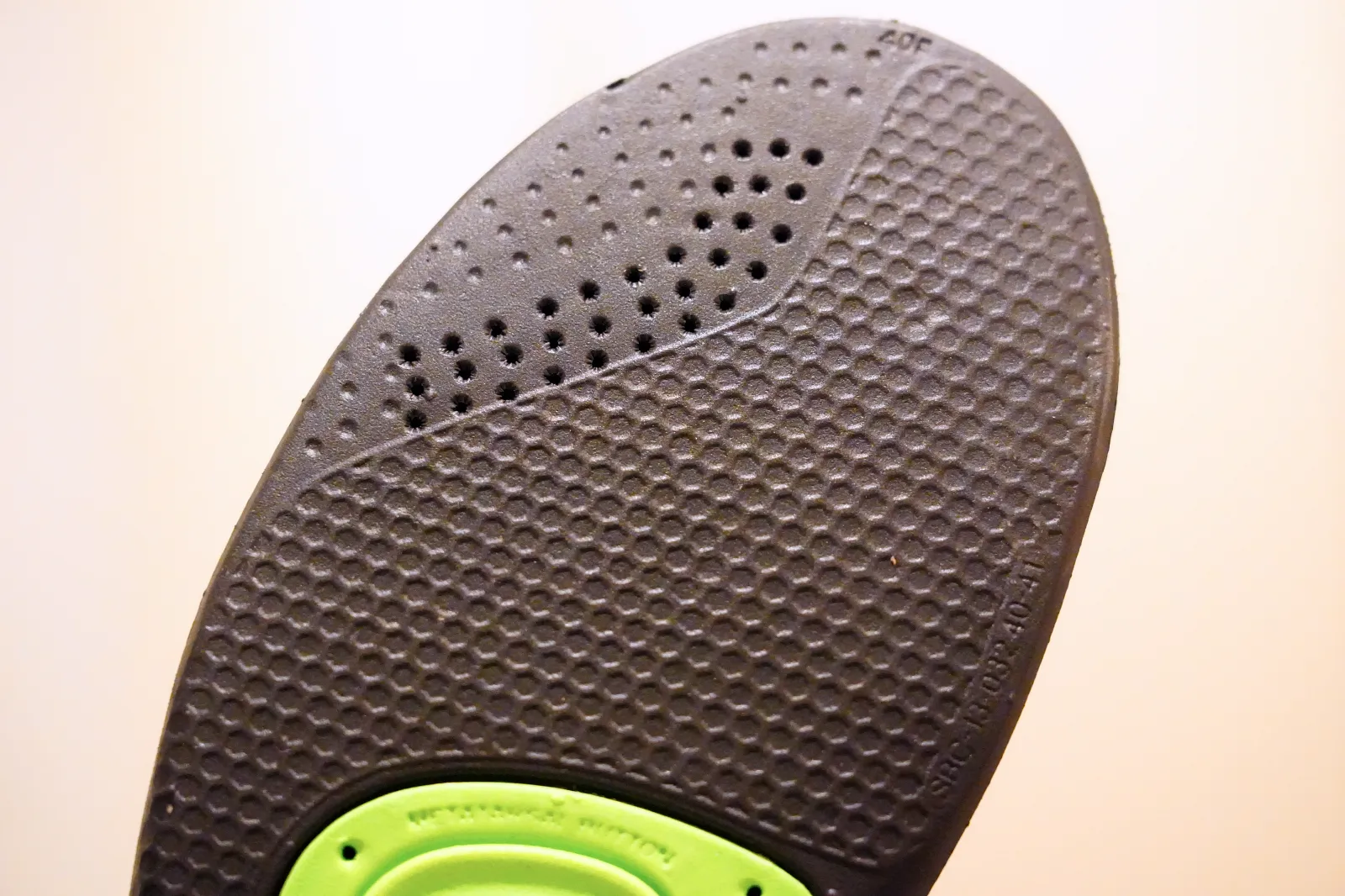 これにより、アーチサポートや中足骨ボタンといった形状が、繰り返されるペダリング負荷の下でもその機能を長期間維持することが期待できる。圧縮成形されにくいものの、使用頻度や体重により1シーズンで交換が必要になる場合もあり、実際の耐久性には使用状況が影響する点も考慮すべきである。