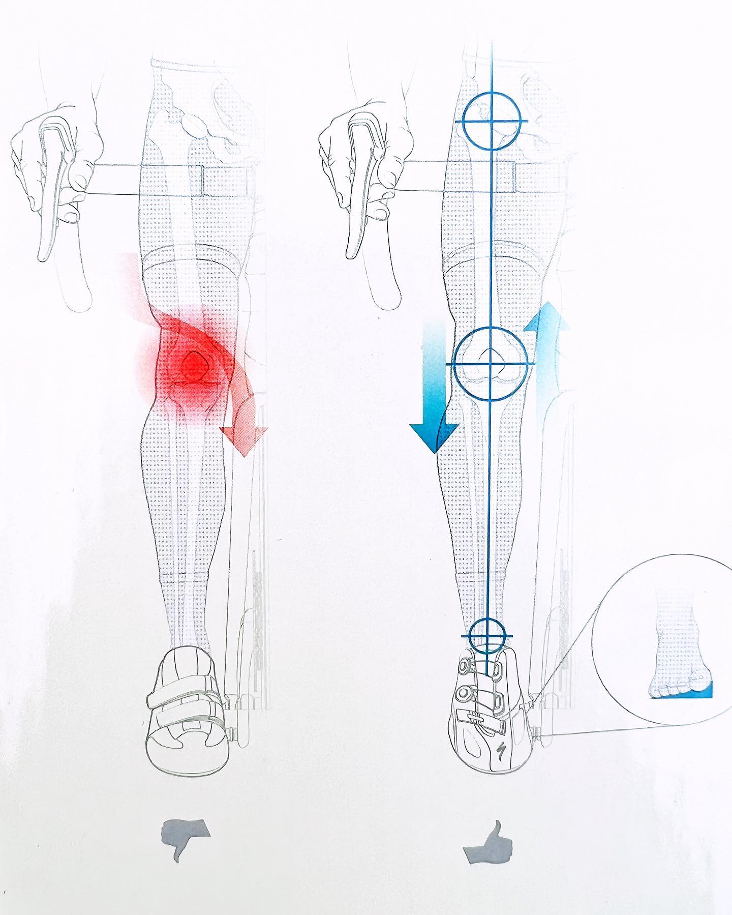 膝関節は、ペダリング運動において大きな負荷がかかる部位であり、不適切なアライメントは膝の内側や外側、あるいは膝蓋骨周辺にストレスを集中させ、痛みや傷害を引き起こす原因となる。