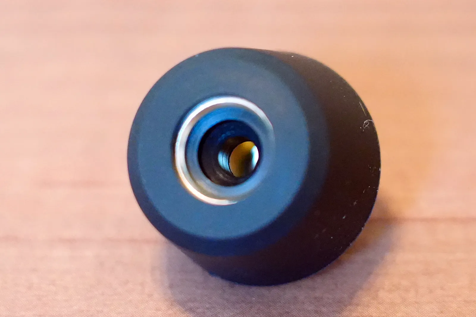 紛失しがちなバルブアダプターの保管にも配慮が見られる。本体底部にはネジ式のスロットが設けられており、使用しないアダプター(例えば米式アダプター)をねじ込んで固定しておくことが可能だ。これはスマートな解決策だが、アダプターを装着した状態ではポンプ全体の長さがわずかに増すことになる。