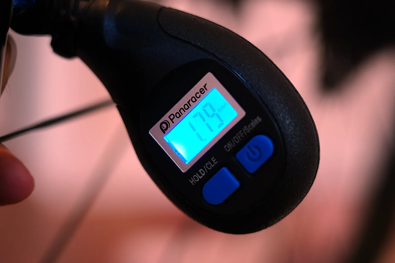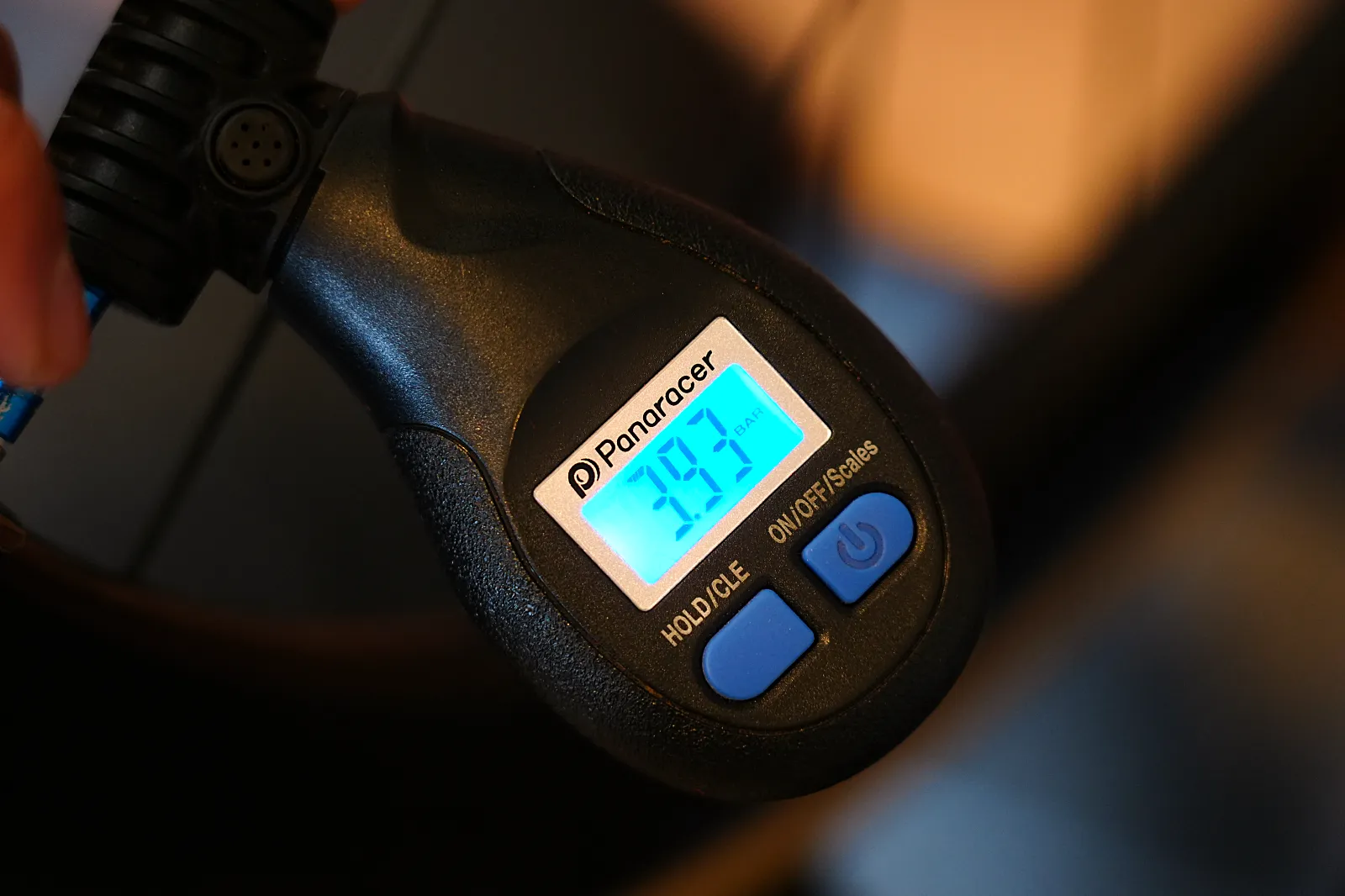 バルブに接続すると瞬時に現在のタイヤ内空気圧を表示する機能が搭載されており、これは他の電動ポンプでは必ずしも一般的ではない便利な特徴だ。そして、精度もパナレーサーのデジタルゲージとほぼ同一の値を示した。この圧力計の精度はすさまじい。