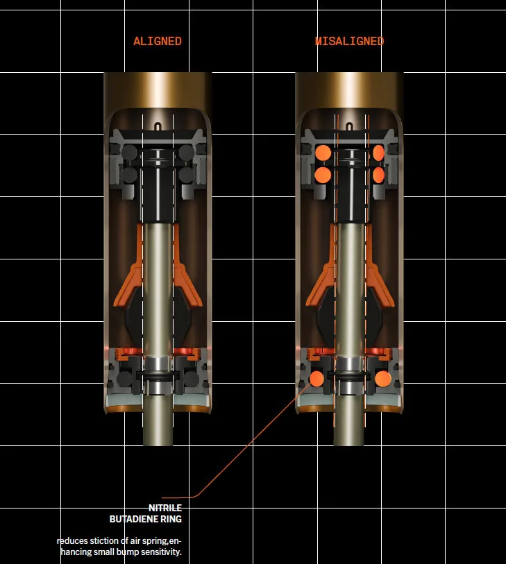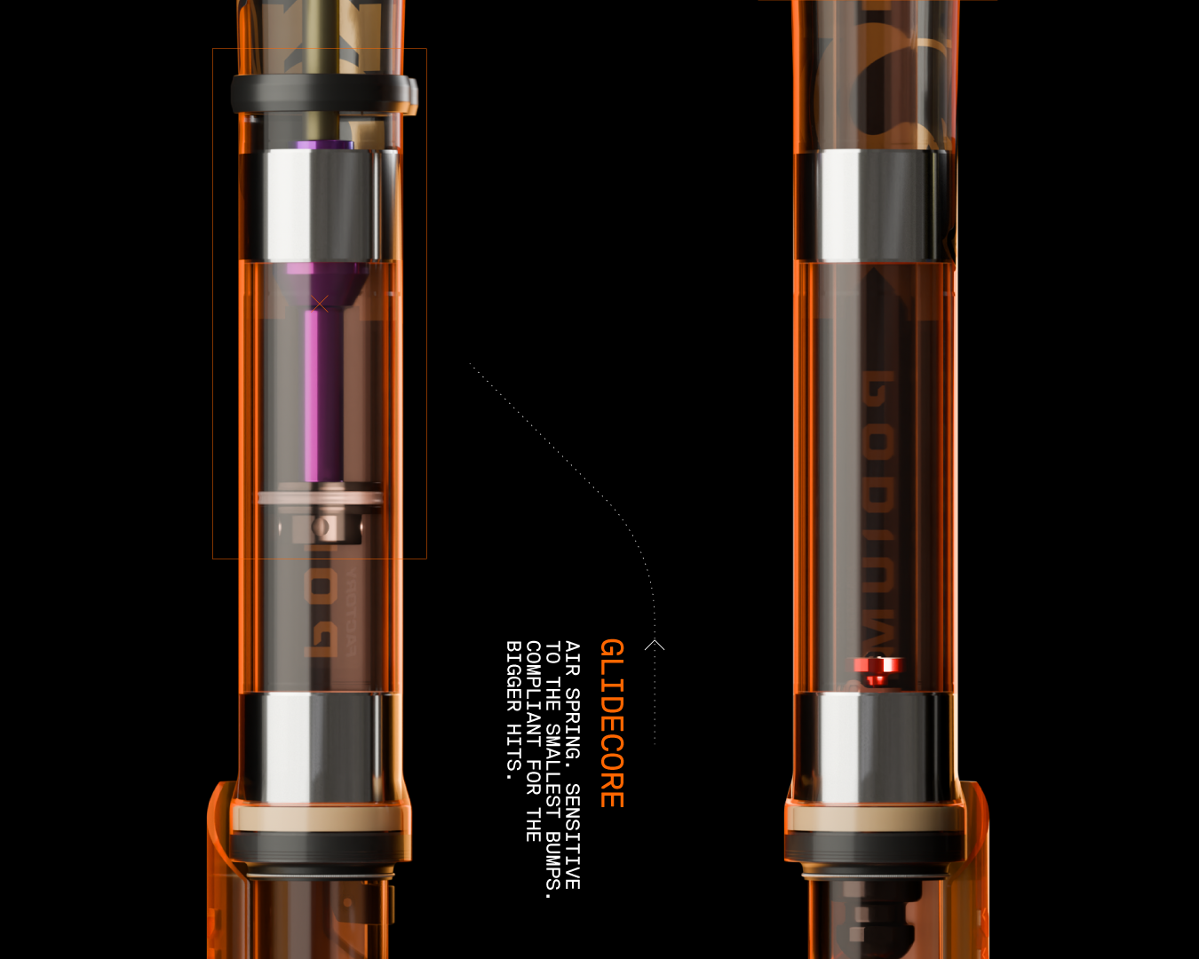 このダンパーと対をなすのが、GlideCoreエアスプリングである。このシステムは、エアシャフトを支える部分に柔軟なニトリルブタジエンゴム製のリングを採用している。