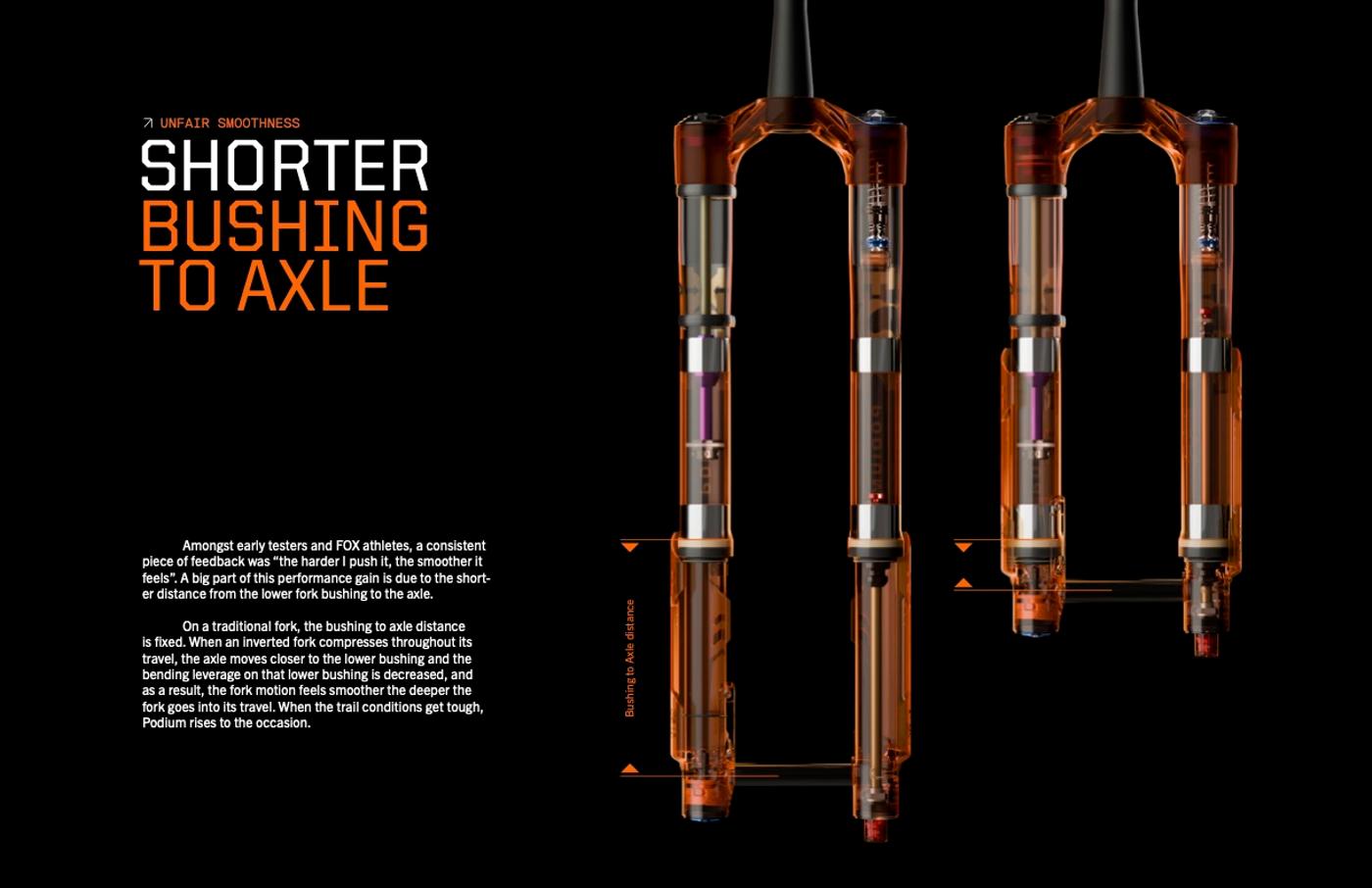 第二に、ブッシングの配置における圧倒的な優位性だ。Podiumのブッシングオーバーラップ(上下のブッシング間の距離)は175mmに達し、これはFox 38に対して32%、ダウンヒル用のデュアルクラウンフォークであるFox 40と比較しても7%長い。