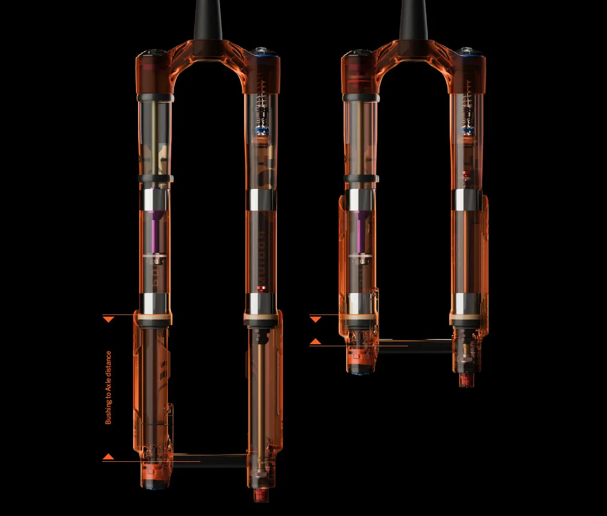 さらに、倒立フォーク特有の現象として、ストロークするにつれてアクスルとロワーブッシング間の距離が短くなるため、ブッシングにかかるてこの力が減少し、トラベルの奥深くでよりスムーズに動くという特性を持つ。