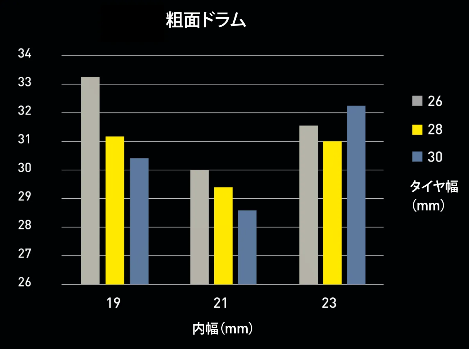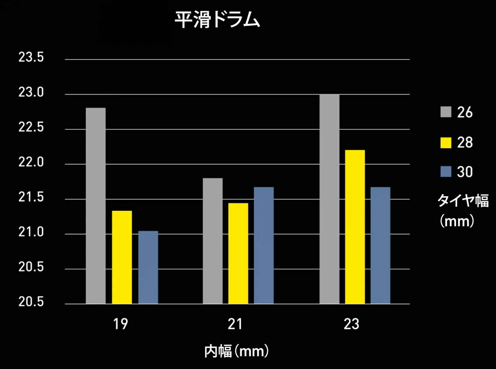 滑らかな路面を模した「平滑ドラム」と、石畳のような荒れた路面を想定した「粗面ドラム」という2種類のテスト装置を用い、様々なリム内幅とタイヤの組み合わせにおける転がり抵抗を計測した。その結果、ある共通の傾向が明らかになった。