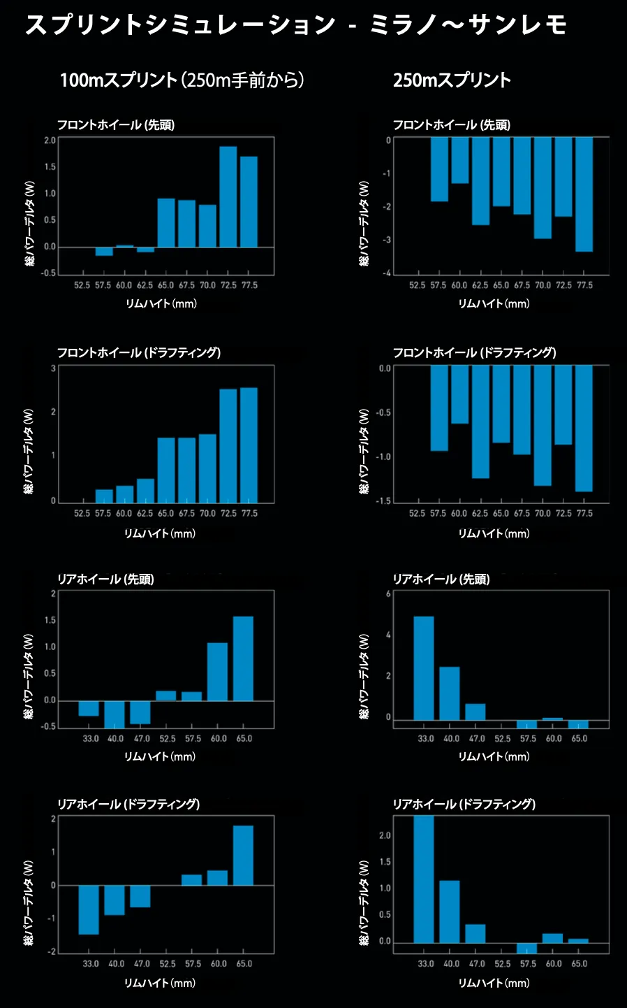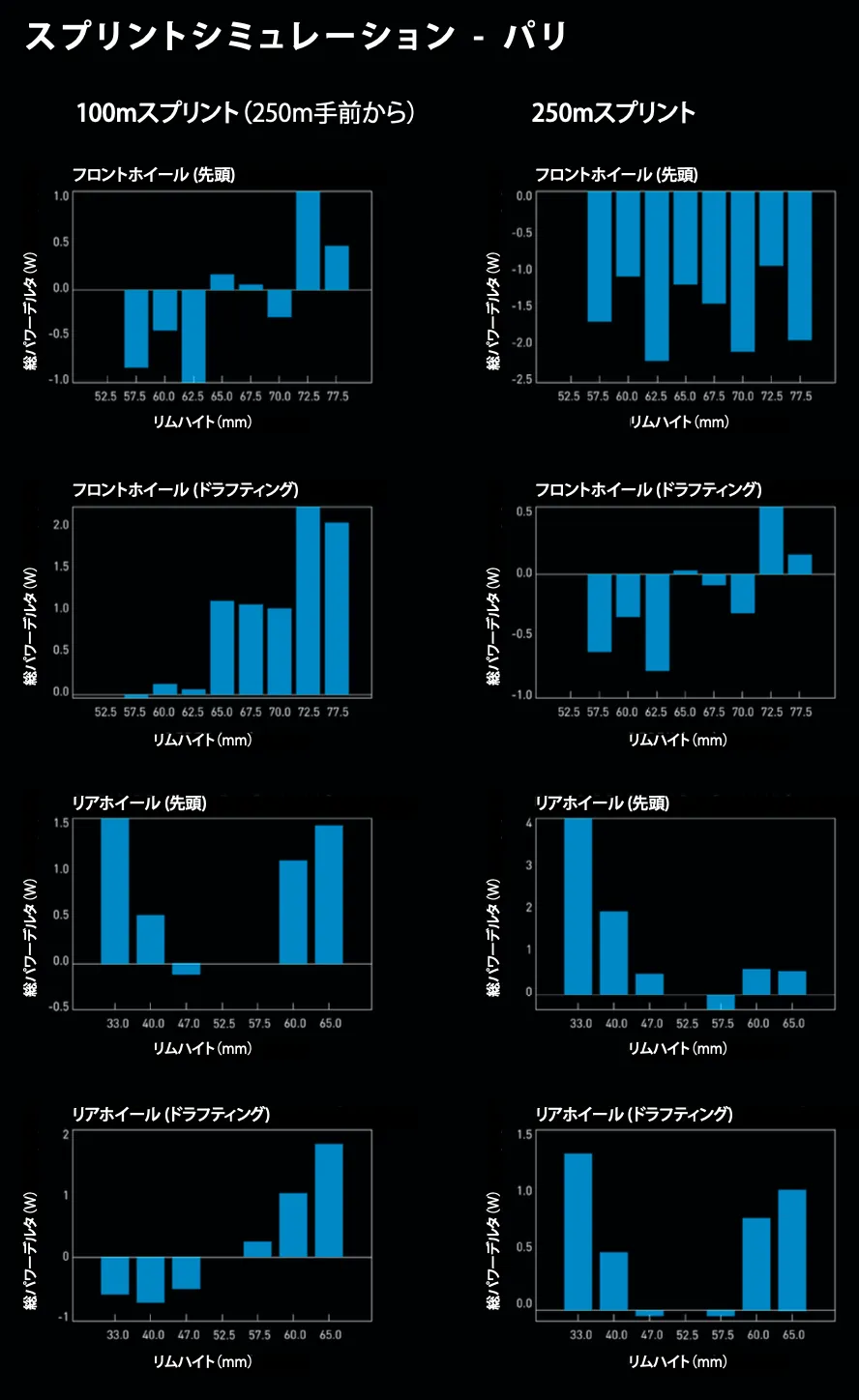 たとえ150mの短いスプリントであっても、その差は約8cmに達する。このシミュレーションは、リムハイトを高くすることによる重量や慣性の増加という僅かなデメリットを、空力性能の向上がはるかに上回ることを明確に示している。