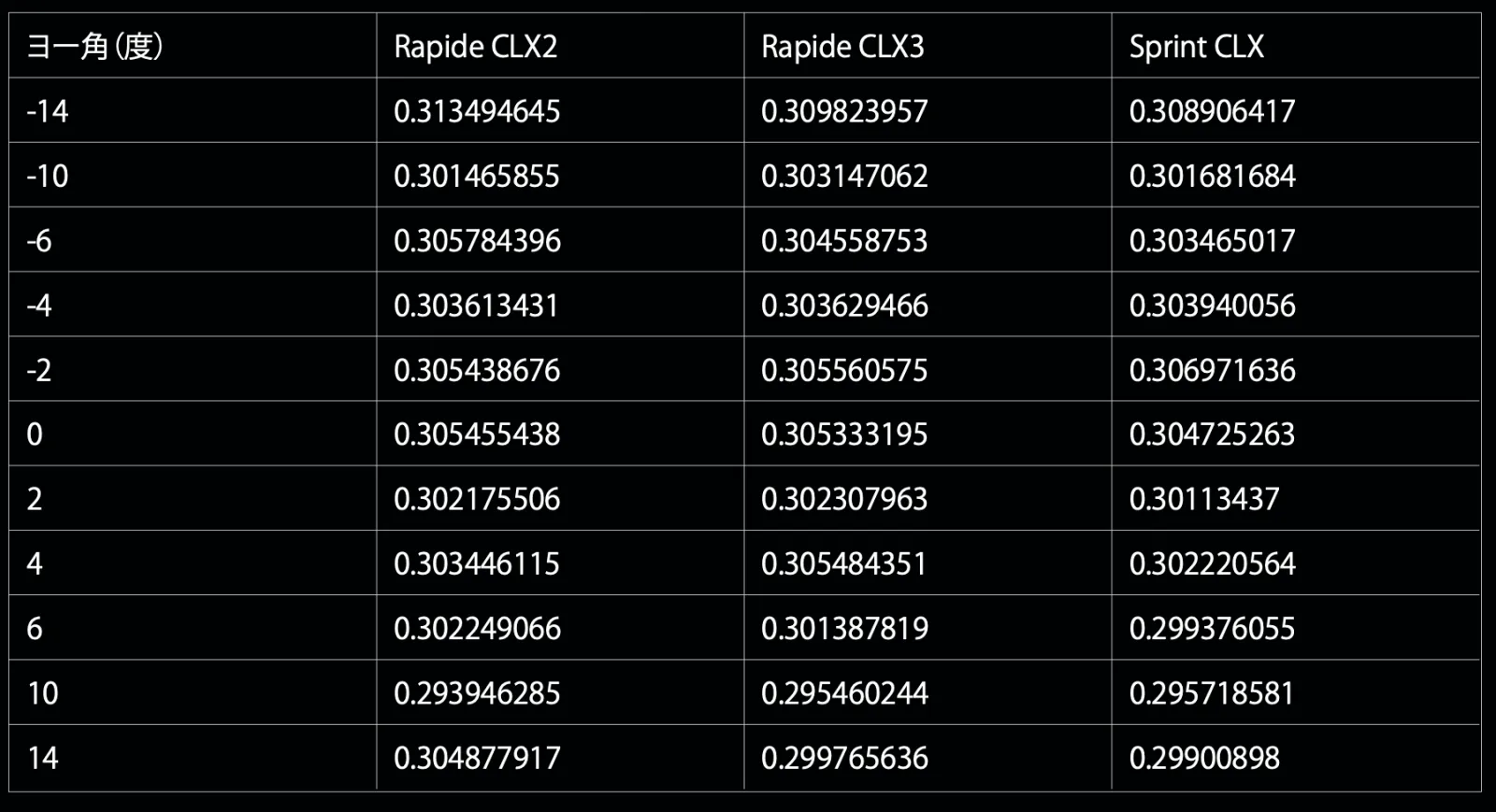 Rapide CLX III: 前作CLX IIとほぼ同等の空力性能を持ちながら、特定のヨー角(-14度、6度、14度など)ではCLX IIを上回る性能を見せる。これは、リム形状の最適化により、215gという大幅な軽量化を達成しつつも、空力性能を犠牲にしていないことを意味している。