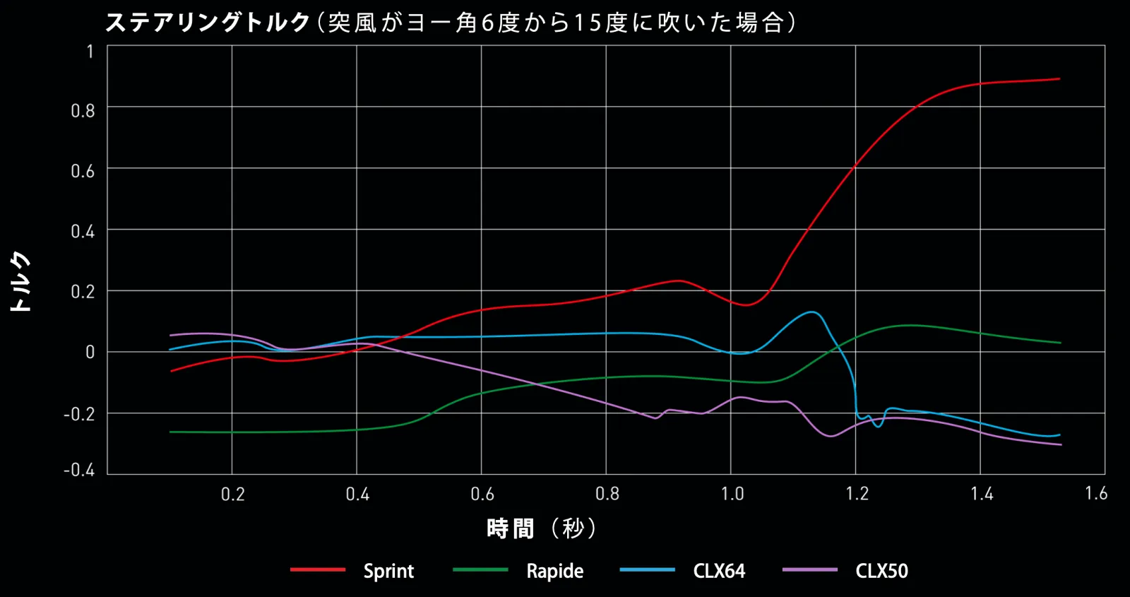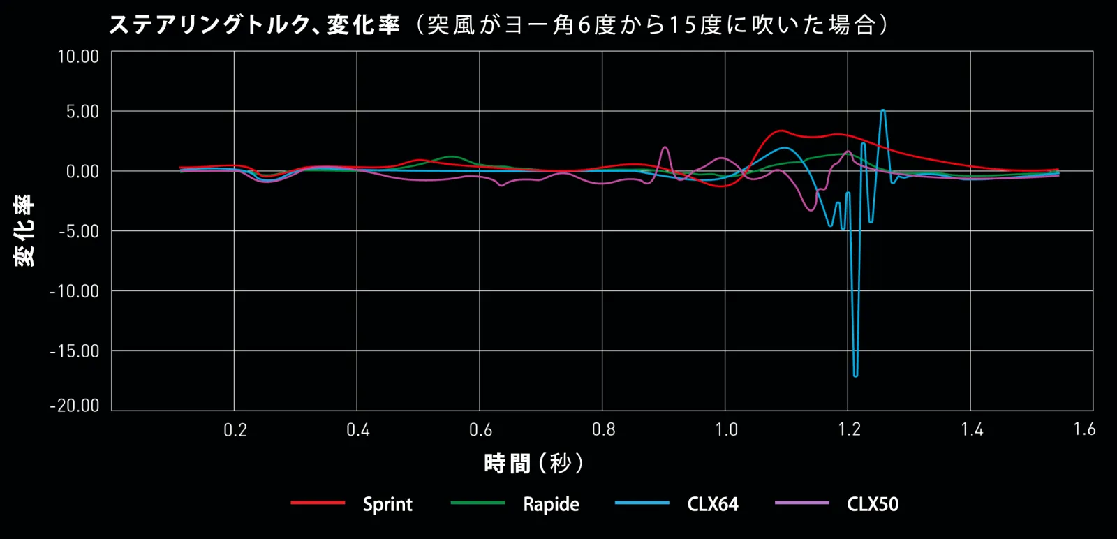 さらに、ステアリングトルク(横風によってハンドルに発生するねじれ)の経時変化を示すグラフでは、CLX III(グラフ中ではRapide)のトルク変化が、よりリムハイトの低い旧型のCLX50に匹敵するほど穏やかであることが示されている。