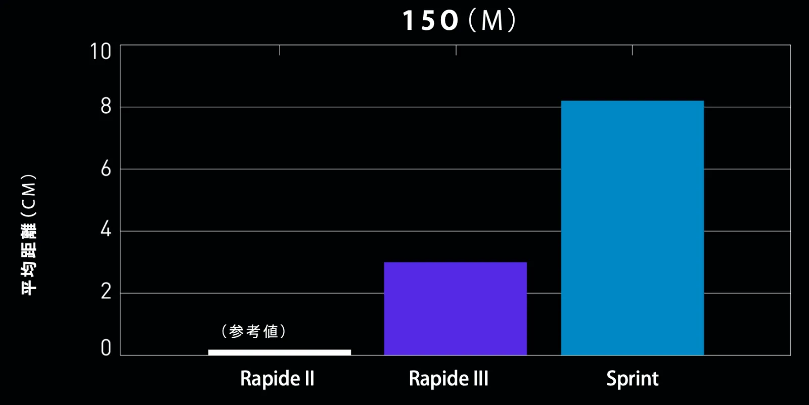 150mスプリント: より短い150mのスプリントでも、SprintはCLX IIに対して約8cmの差をつける。
