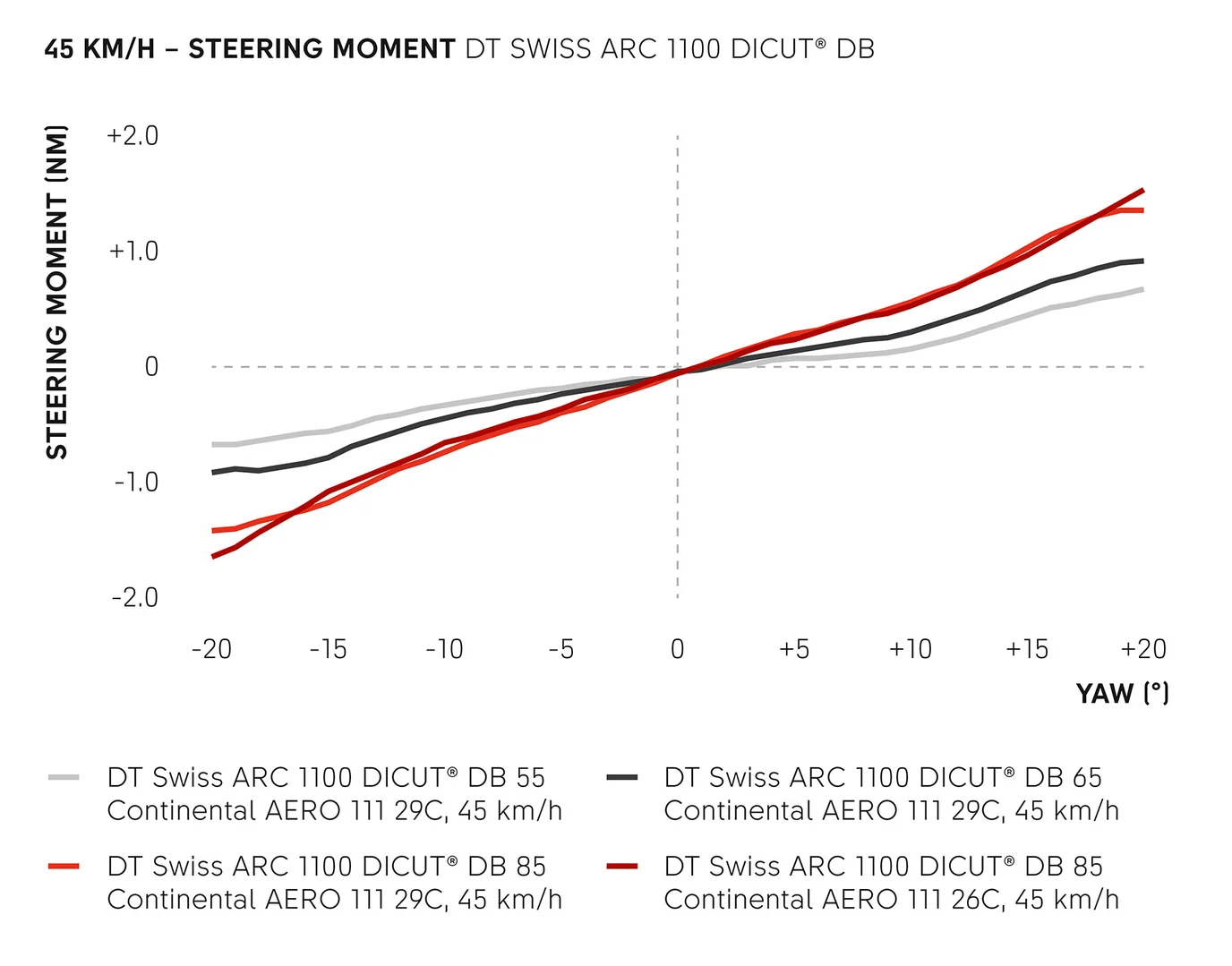 リムの先端部分は比較的狭いV字に近く、ゼロヨー角(真正面からの風)における前面投影面積を減らし、基本的な空気抵抗を低減する。一方で、リム側面は幅広のプロファイルとステップ構造により、高いヨー角(横風)においても気流をリム表面に沿わせ、ステアリングモーメントを低減し、安定性を向上させる。