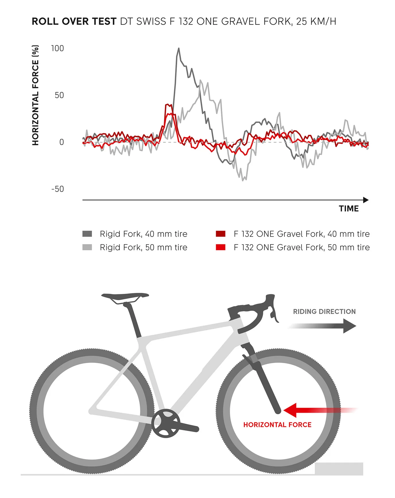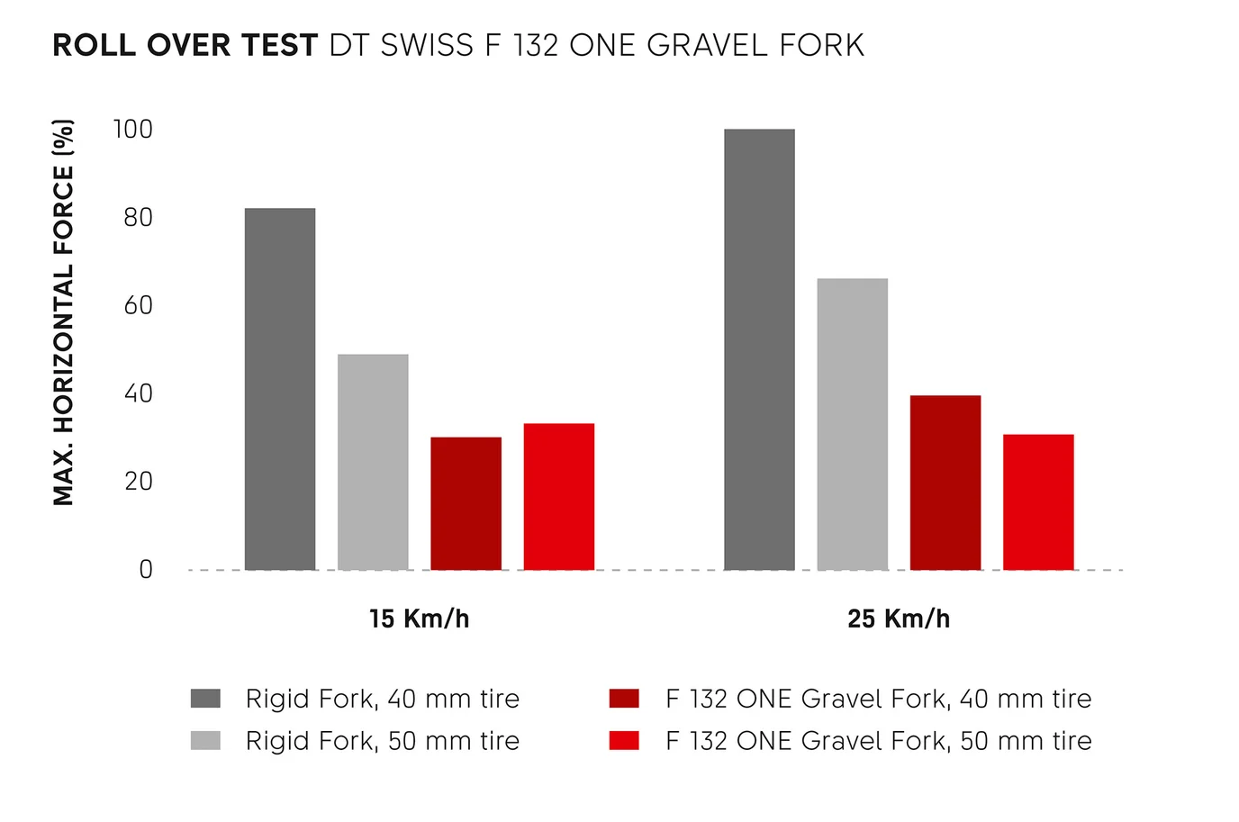 この主観的な感覚は、DT Swissが実施した「ロールオーバーテスト」のデータによっても裏付けられている。このテストでは、リジッドフォークと比較して最大で63%のピーク衝撃力を削減したと主張されている。