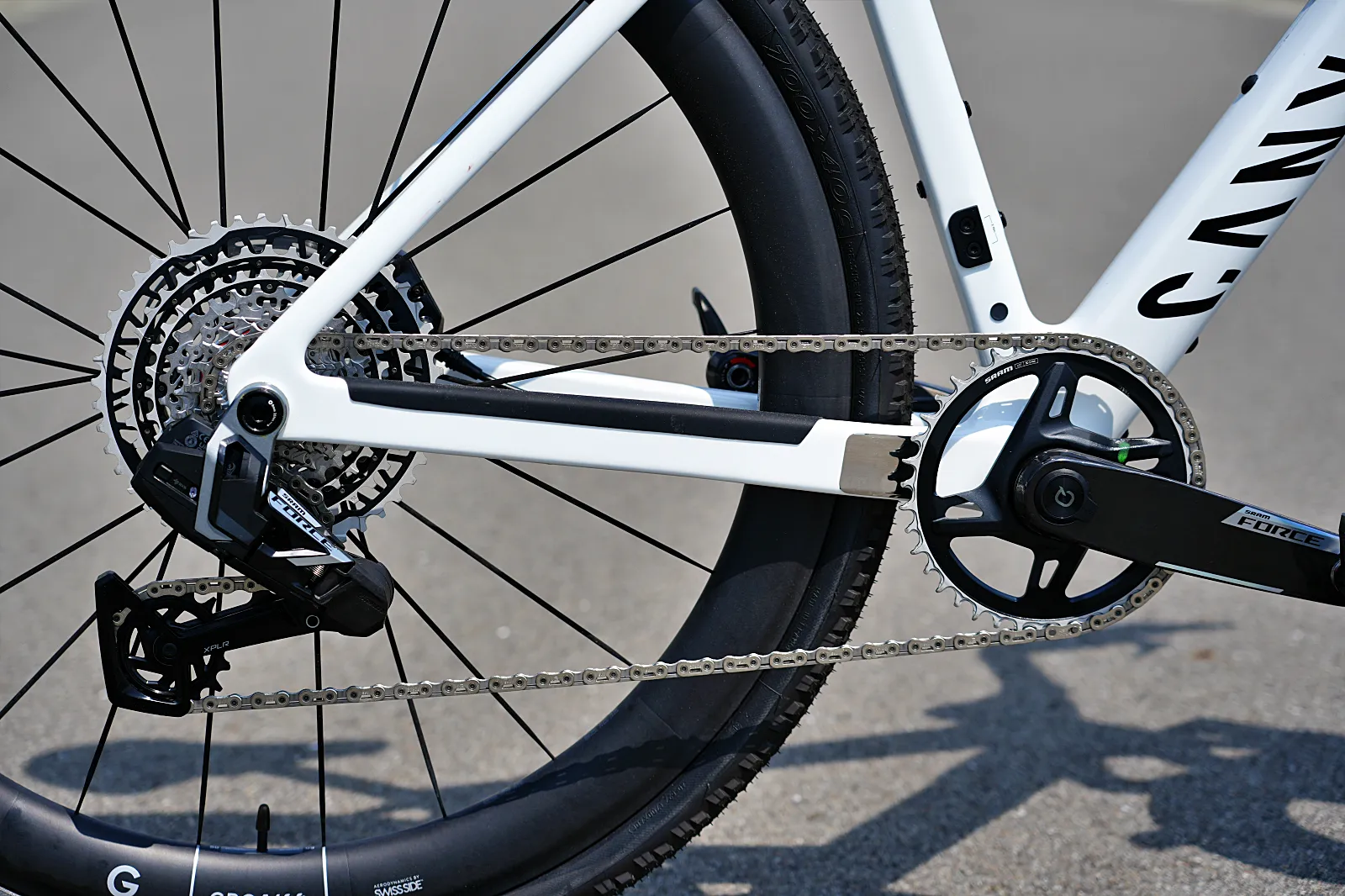 ドライブトレインには、SRAMのグラベル専用コンポーネントであるSRAM Force XPLR Etap AXS E1が採用されている。1×12速システムと10-46Tのワイドレンジカセットは、シンプルな操作性と高いチェーン保持性能を両立し、過酷なグラベルレースの要求に応える。