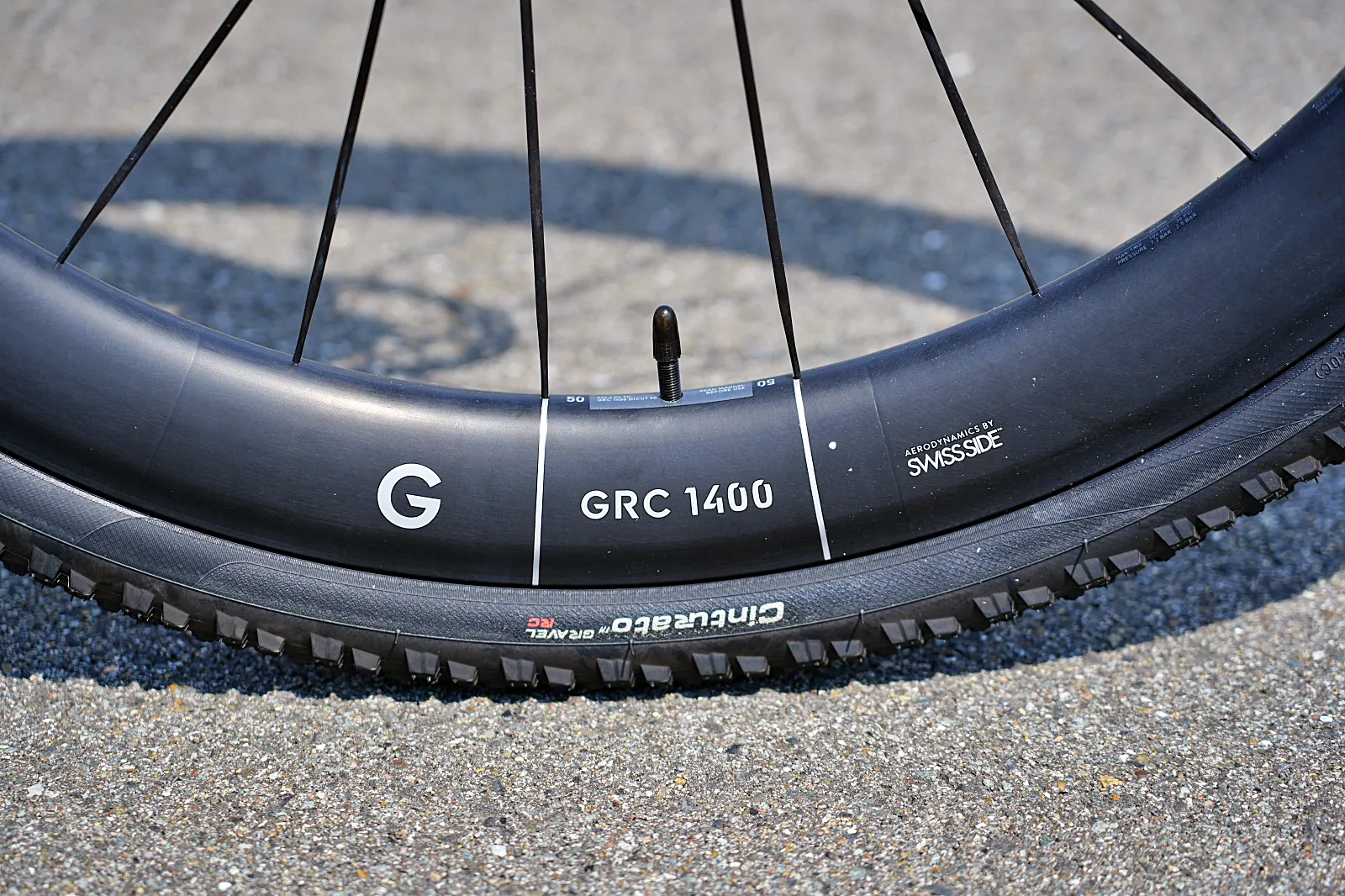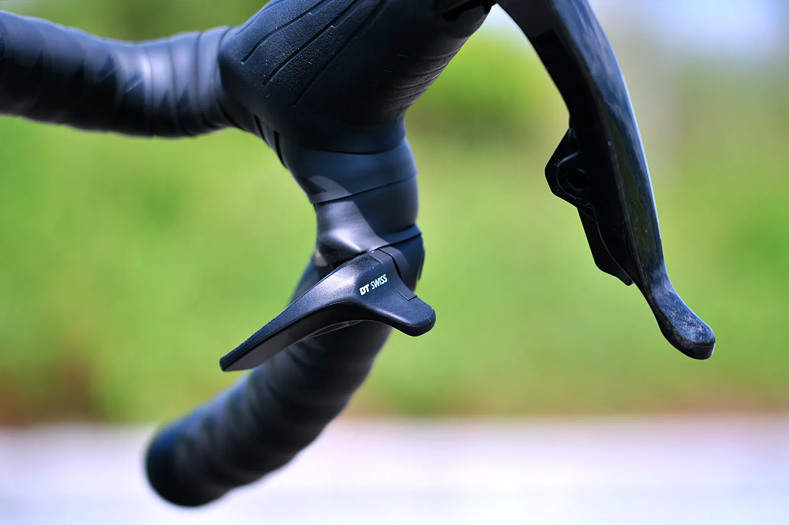 ホイールには、空力性能と耐久性を兼ね備えたDT Swiss GRC1400カーボンホイールが装着されており、フレームのエアロ思想と一貫性のあるアッセンブルとなっている。