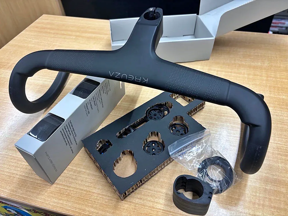 CIMAの空力性能は、フレーム単体だけでなく、統合設計されたコンポーネントによってもたらされる。KREUZA Apex一体型ハンドルバーは、NACA(アメリカ航空諮問委員会)由来の翼断面形状を持ち、重量を300g未満(380x110mm)に抑えつつ、180 N/mmという高い剛性を実現している。