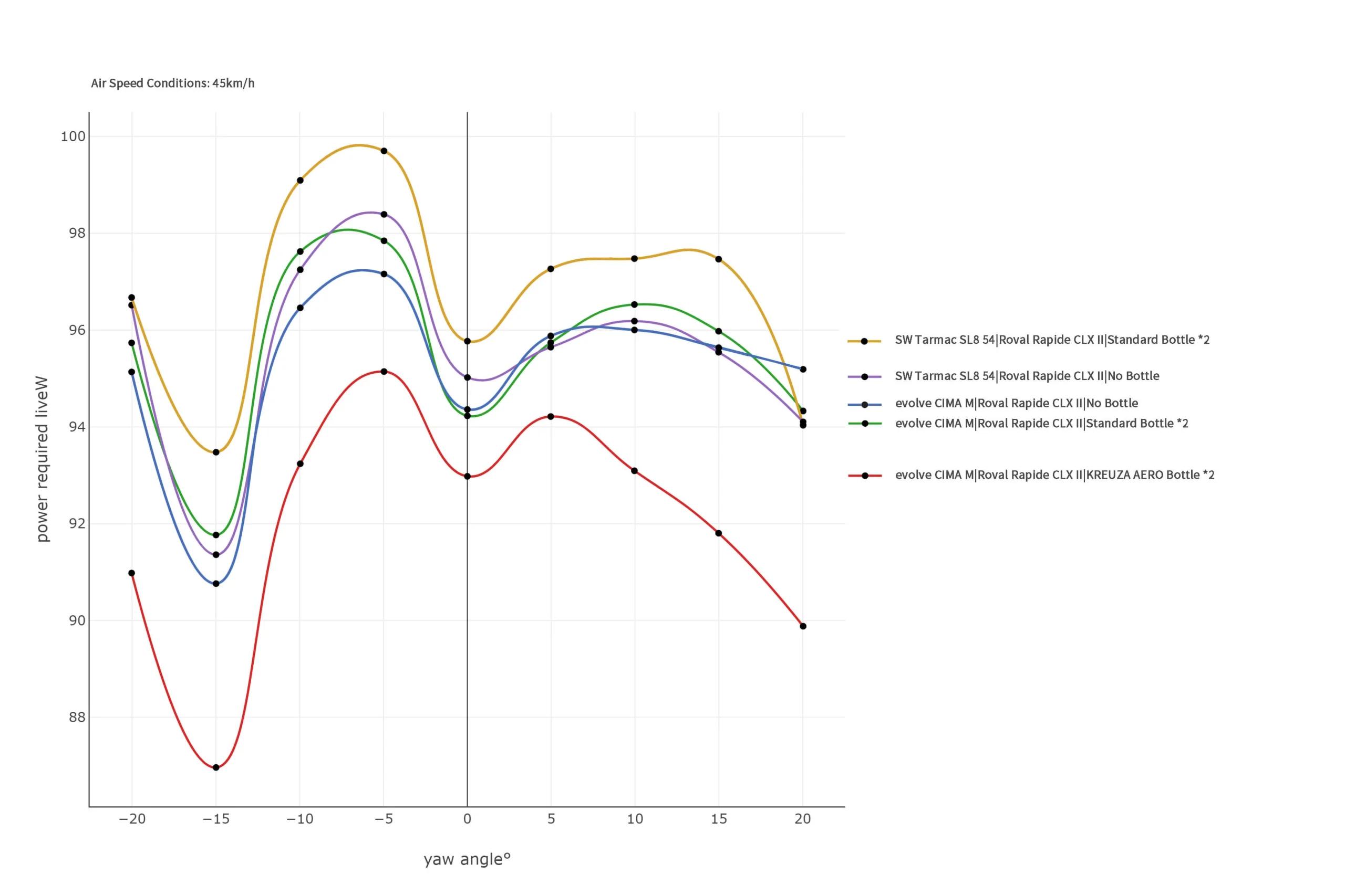 evolveが幅広いヨー角(-20°から+20°)にわたる生のCdA値(空気抵抗係数と前面投影面積の積)を公開したことは特筆に値する。これは、単一のワット削減値(前方のみ等)だけを提示する多くの競合他社のマーケティングとは一線を画す。