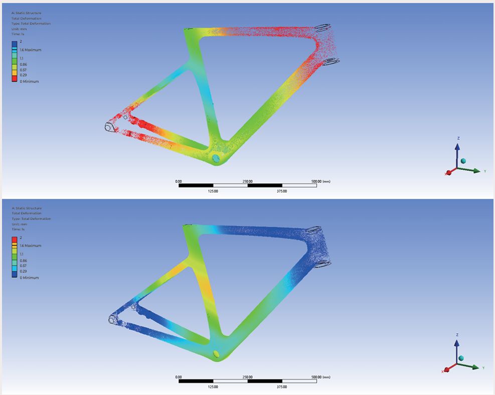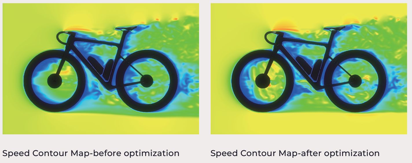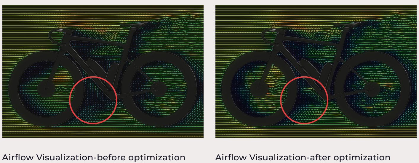開発の初期段階で、計算流体力学(CFD)シミュレーションが多用された。解析の結果、シートチューブとシートポスト周辺が空力改善の鍵となる領域であることが特定された。これを受け、Di2バッテリーをシートチューブ内に統合することで、よりスリムで空気抵抗の少ないチューブ形状を実現した。