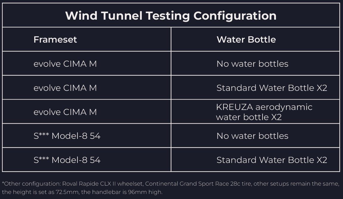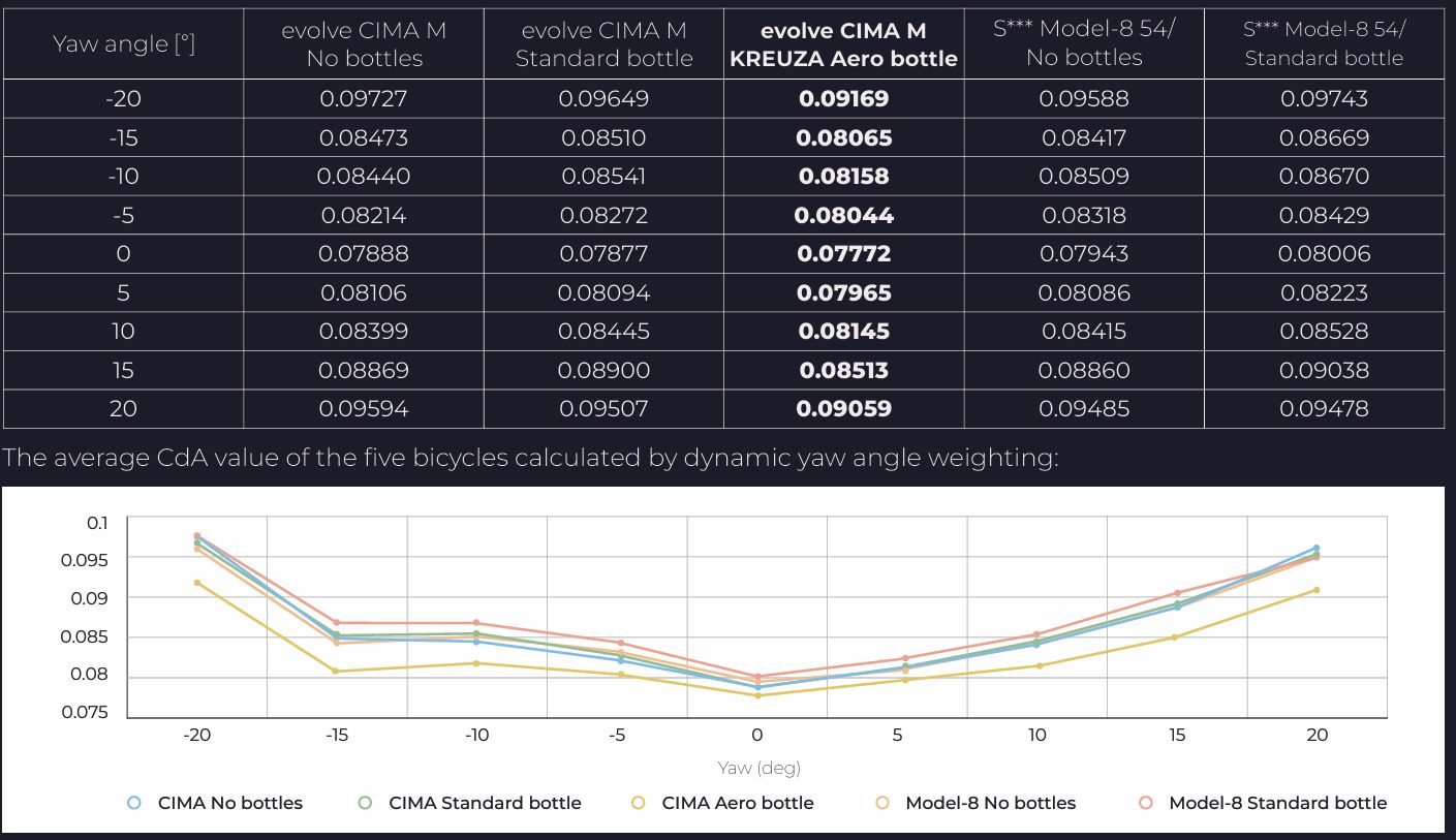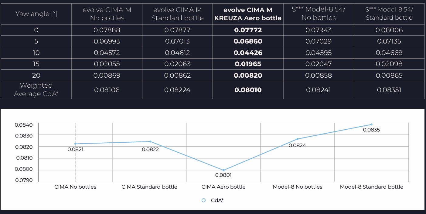 このデータから導き出される最も重要な結論は、CIMAが専用のKREUZAエアロボトルを2本装着した際に、ボトルを全く装着していない状態よりも優れた空力性能を発揮するという点である。