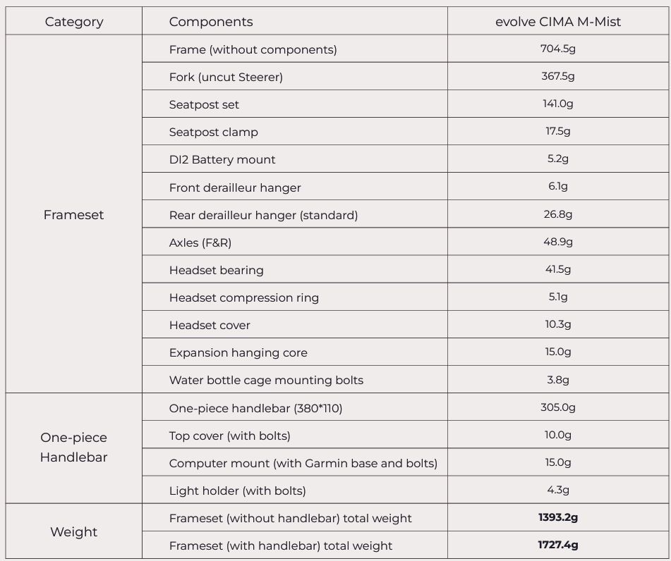 CIMAのもう一つの際立った特徴は、その驚異的な軽さである。Mサイズの未塗装フレーム重量はわずか650gであり、これは現行のディスクブレーキ対応エアロロードフレームの中で最軽量クラスに位置する。