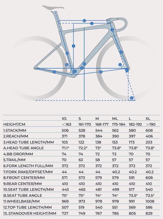 CIMAはXSからXLまでの6サイズ展開で、適応身長は146cmから202cmまでと幅広い。特筆すべきは、サイズごとにフォークオフセット(XS/S/Mで44mm、ML/L/XLで40.2mm)とBBドロップ(XS/Sで74mm、M/MLで72mm、L/XLで70mm)を変化させている点である。