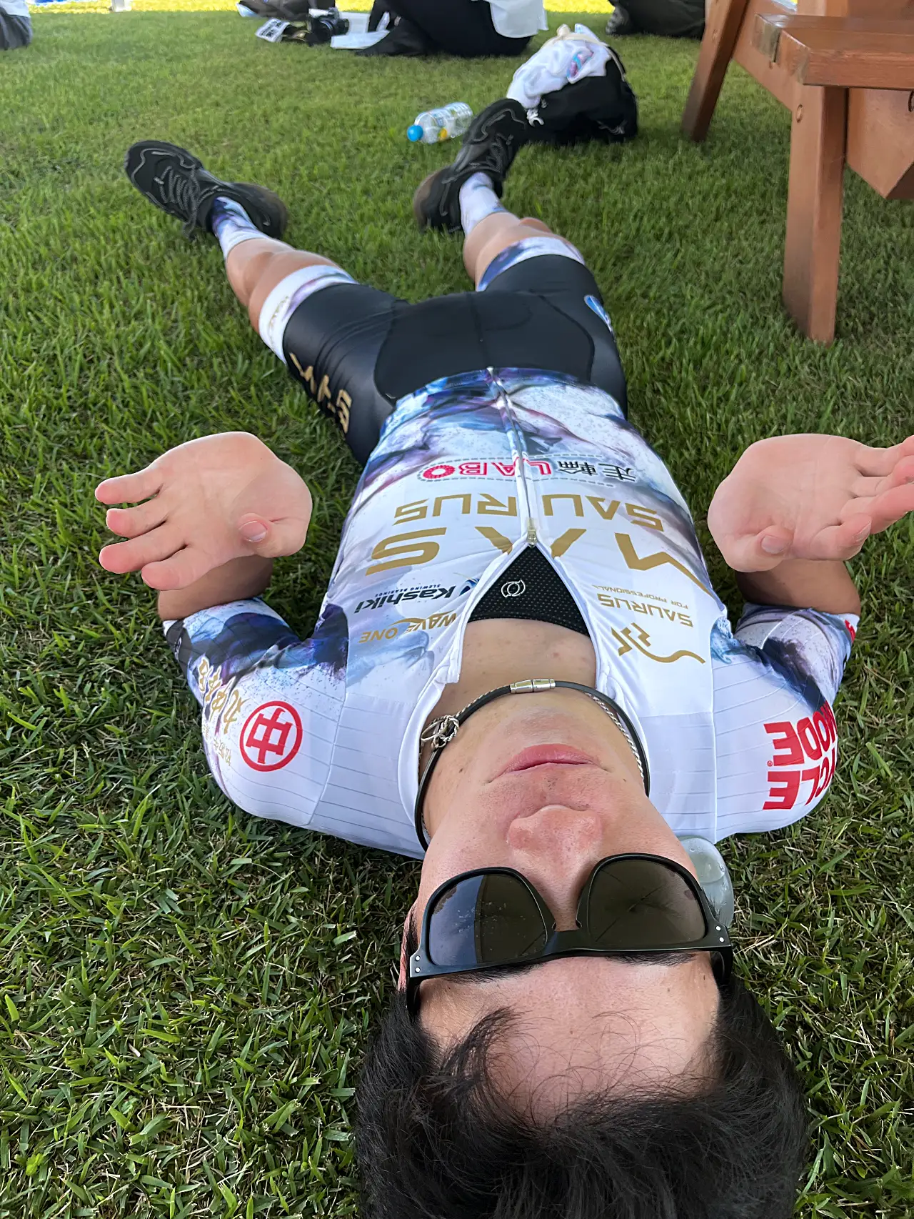 総合優勝したユーゴと年代別優勝した松木さんの表彰を撮影してチームLINEに送る。これぐらいしか役に立てることはない。レース後にユーゴから風呂行こうと誘われたが、「タオルが無いのでいいよ」と断ったんだけど、わざわざ自分のタオルを取りに戻って貸してくれる気の利くイイやつ。
