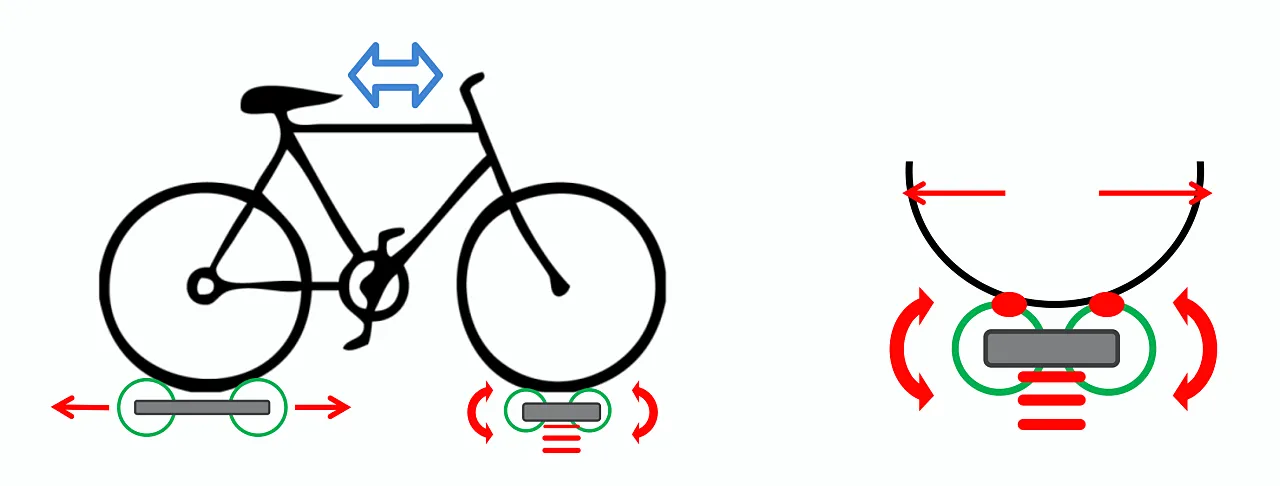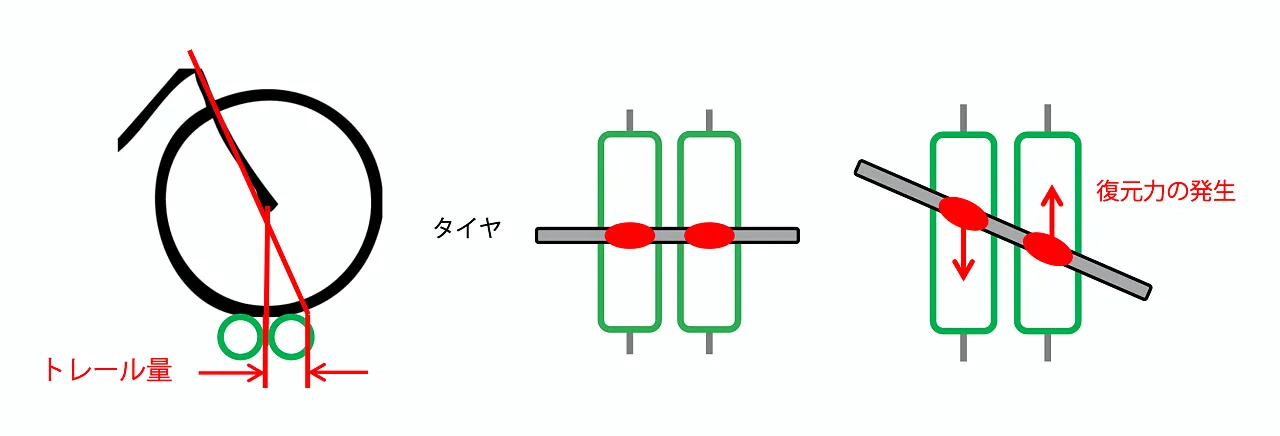 自転車が直進安定性を保つ上で極めて重要な要素が「トレール量」である。3本ローラーでは、前輪の車軸がローラーよりも後方に位置するため、このトレール量が設計値よりも短くなり、ハンドリングが過敏になる傾向があった。