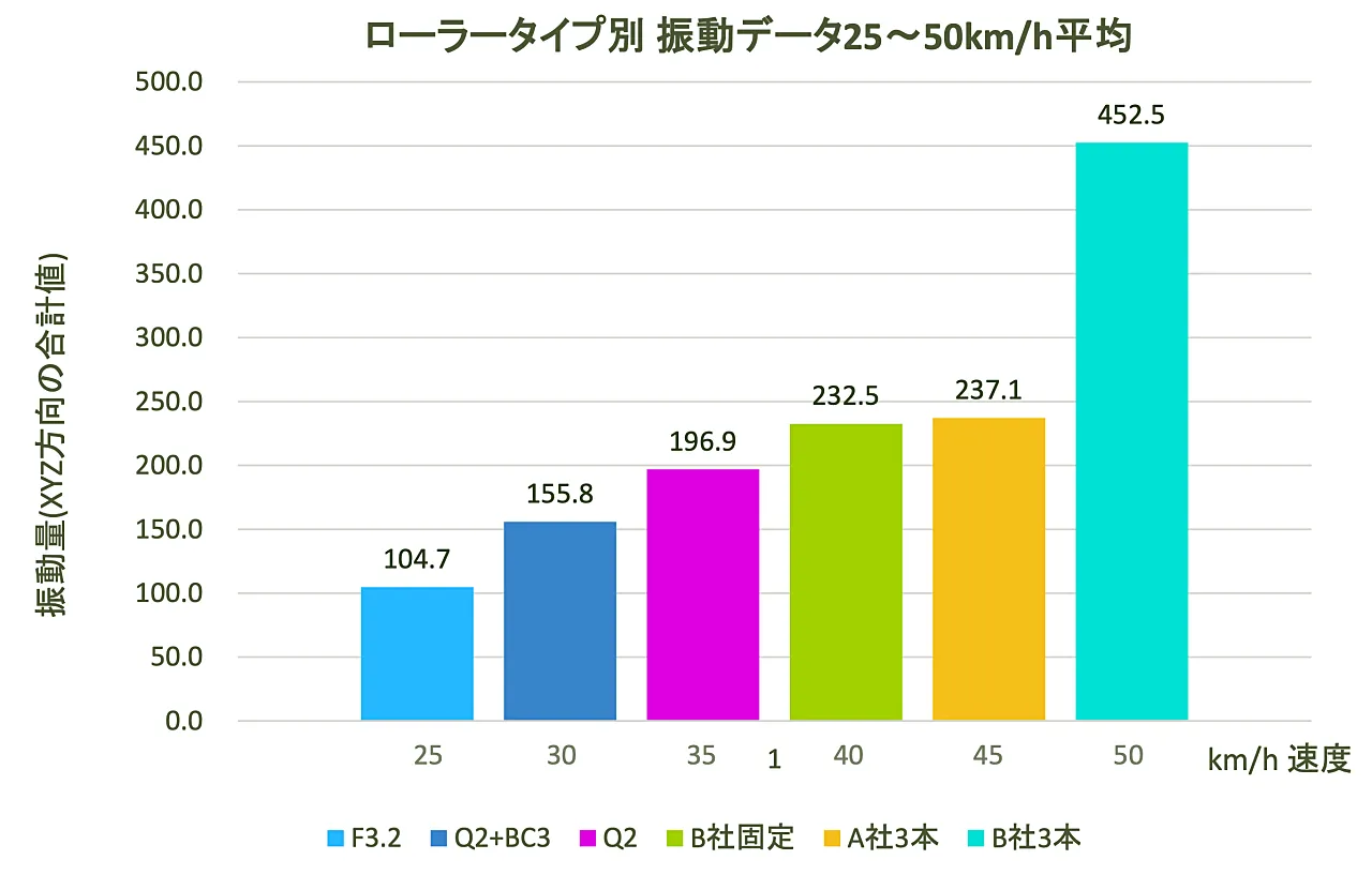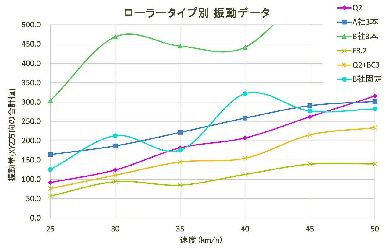 GT-Roller Q2は、ローラー式トレーナーの中でトップクラスの低振動性を誇る。GROWTACが公開している振動データによれば、他社の3本ローラーや一部の固定ローラーと比較しても、その振動レベルは際立って低い。