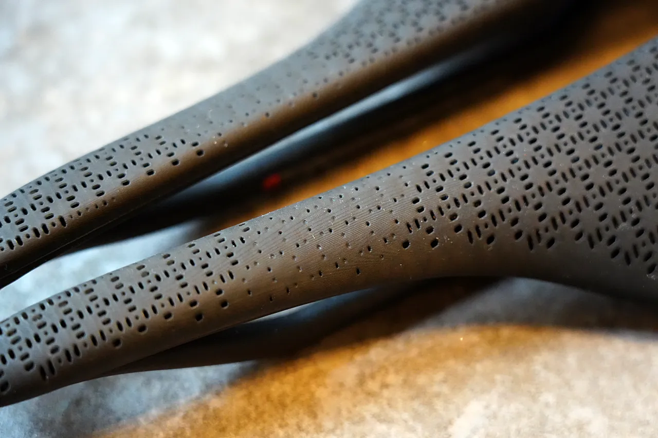 7x10mmのオーバーサイズカーボンレールを採用しており、フルカーボン構造の強度と耐久性を確保している。楕円形状のため、カーボンレール用のサドルクランプが必要になる。安定したカーボンレールの土台の上に快適な3Dプリントのサドルボディが組み合わされている。