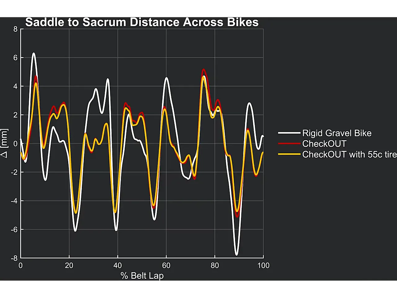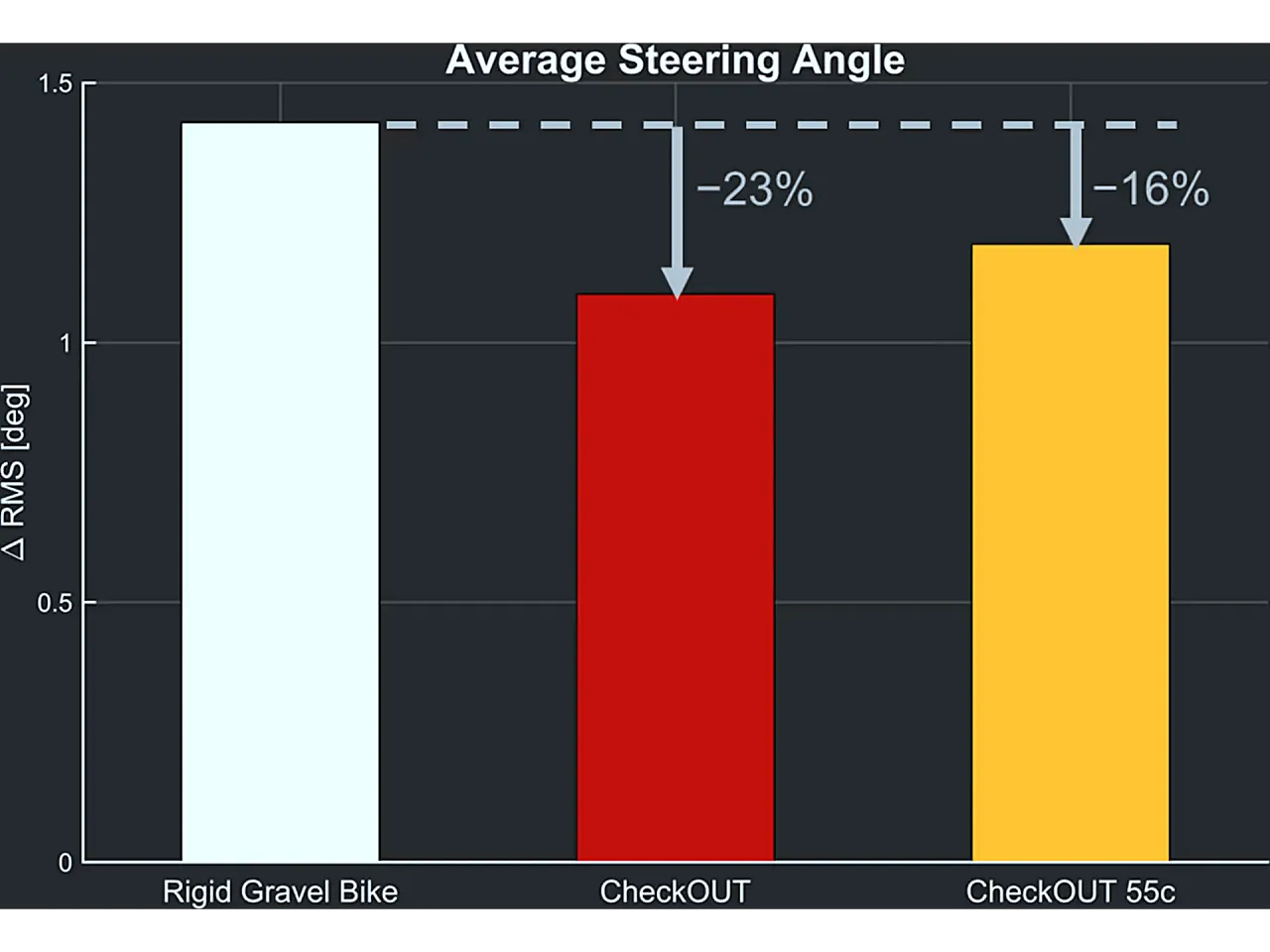 3Dモーションキャプチャーによる解析では、荒れた路面走行時のステアリング角度のばらつきが測定された。50cタイヤを装着したCheckout SLは、同サイズのタイヤを履いたリジッドバイクに比べて、ステアリングのばらつきが23%少なかった。