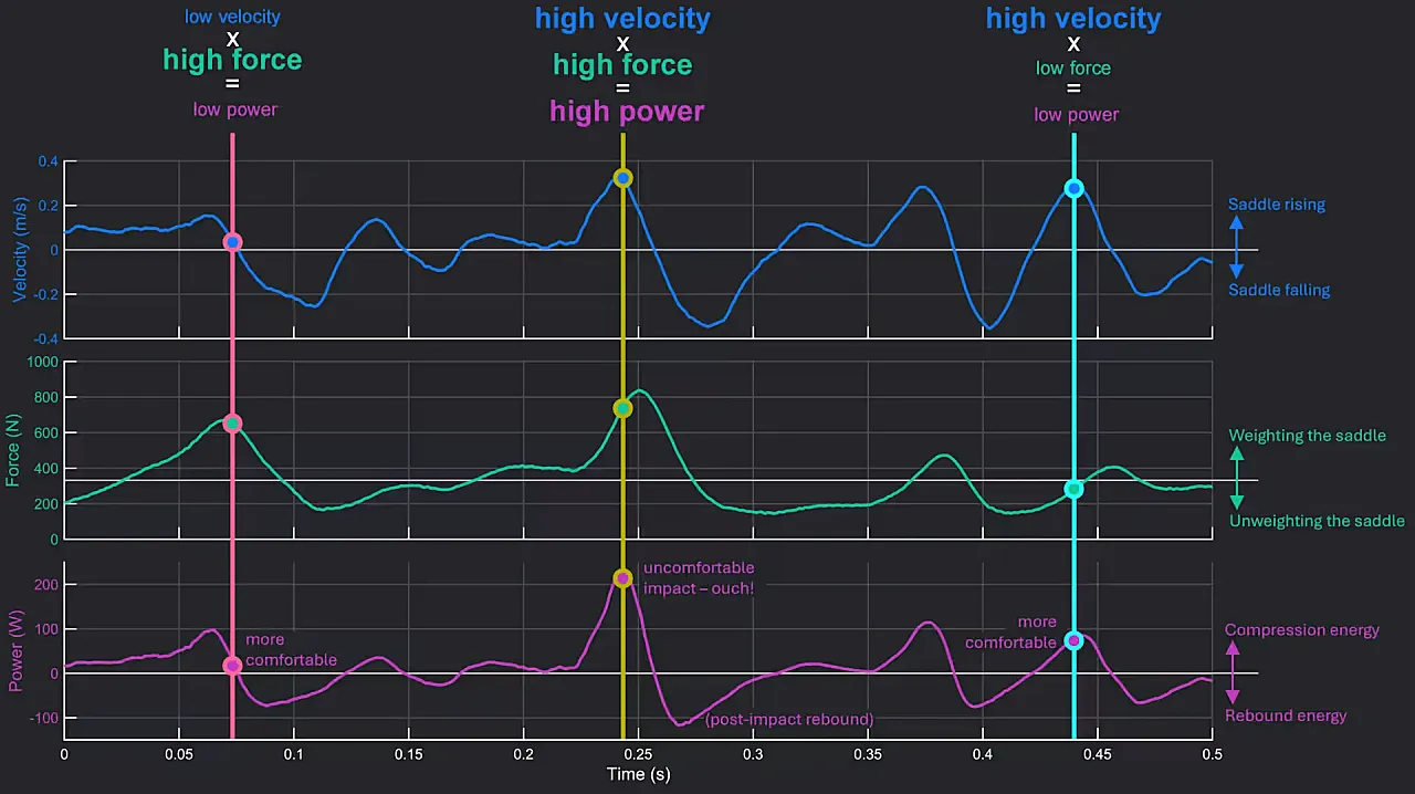 従来の快適性評価は、加速度計のデータや主観的な印象に頼ることが多かった。しかしTrekは、ライダーが実際に「感じる」衝撃をより正確に捉えるため、サドルとハンドルバーにかかる力(F)と速度(v)を同時に測定し、その積である「振動パワー」という物理量に着目した。