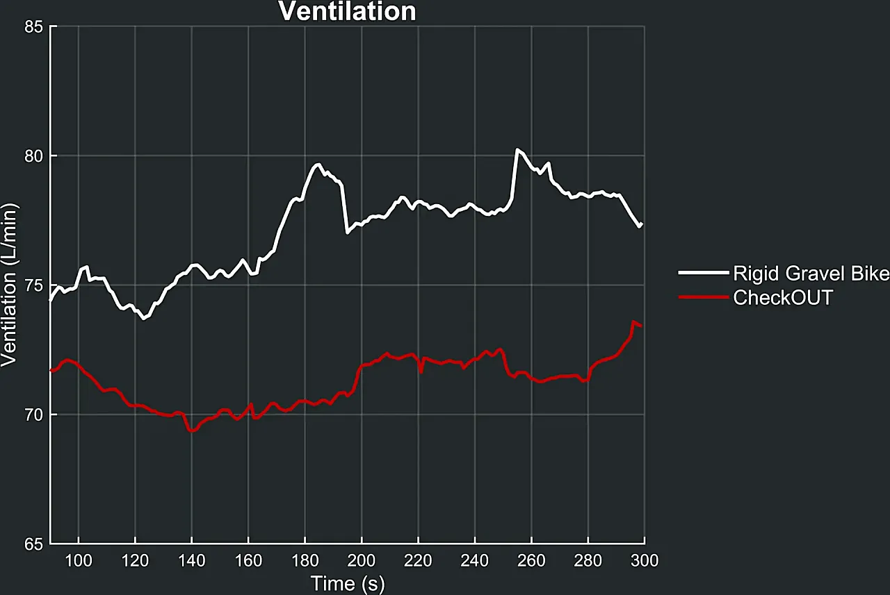 「快適性は速さに繋がる」という格言は、生理学的な観点からも証明された。代謝マスク(VO2 Master)を用いた実験で、荒れた路面を走行中のライダーの換気量(L/min)を測定したところ、Checkout SL搭乗時はリジッドバイクと比較して平均7.3%減少した。