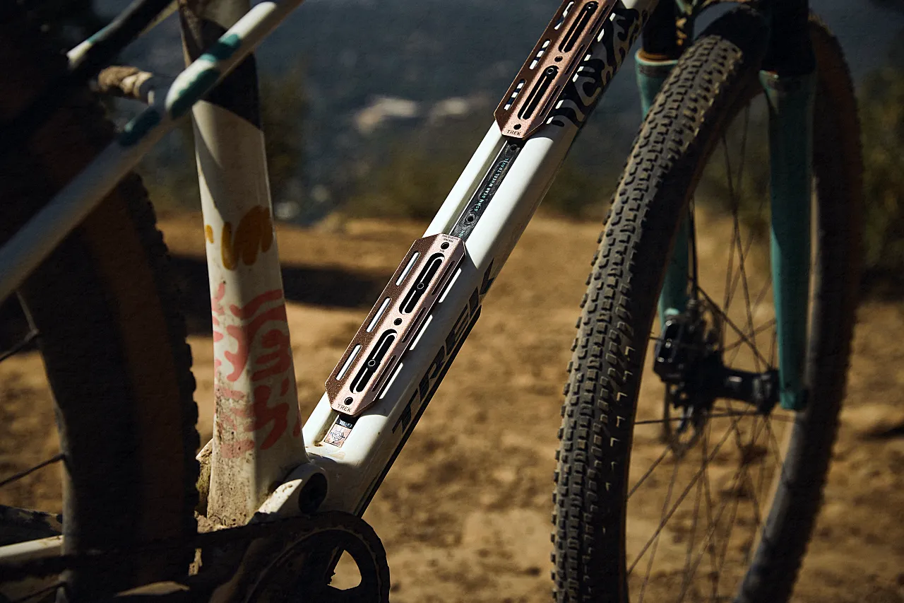 Checkout SLは、バイクパッキングへの徹底したシステムアプローチで設計されている。最大の課題であったフルサスペンションバイクへのリアキャリア搭載に対し、Trekはサスペンションの動きに同調して上下する独自のリンケージを持つ専用リアラックを開発した。