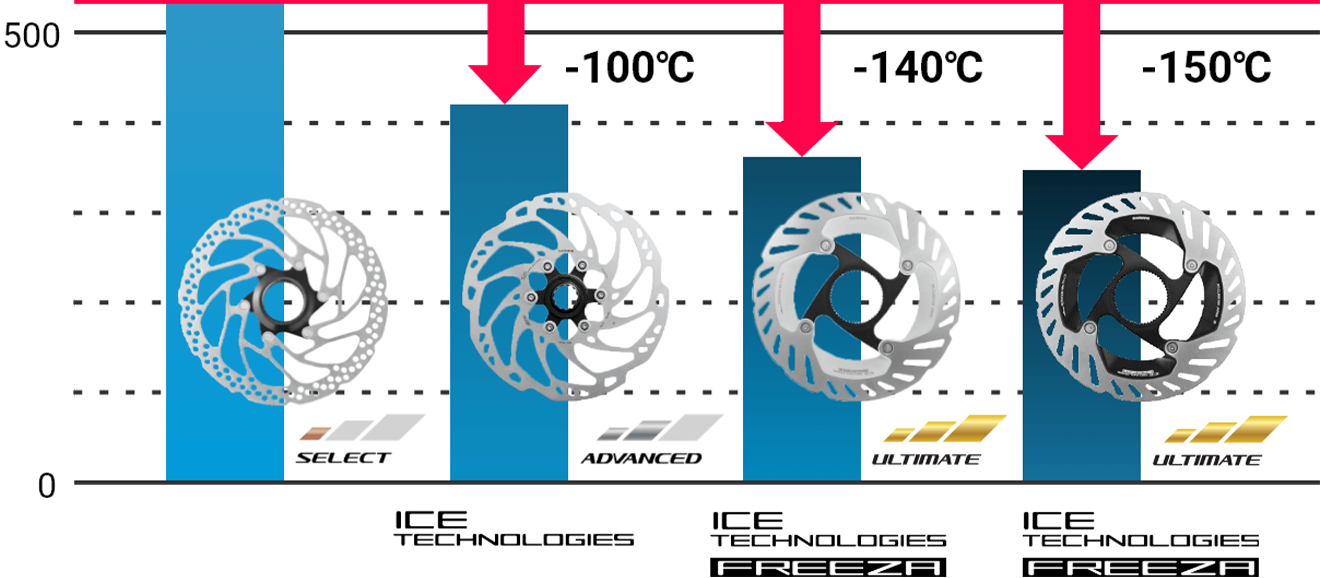 - SM-RT800/RT-MT800 (アイステクノロジーフリーザ): アルミニウム製フィンの追加により、SM-RT70を凌駕する冷却性能を発揮。テストでは、5分間の連続ブレーキ試験において、SM-RT800がSM-RT70よりも7.9℃低い温度を記録した。試験時の温度は約50℃と低かったが、200℃を超えることもある実際の長い下り坂では、この差はさらに拡大する。