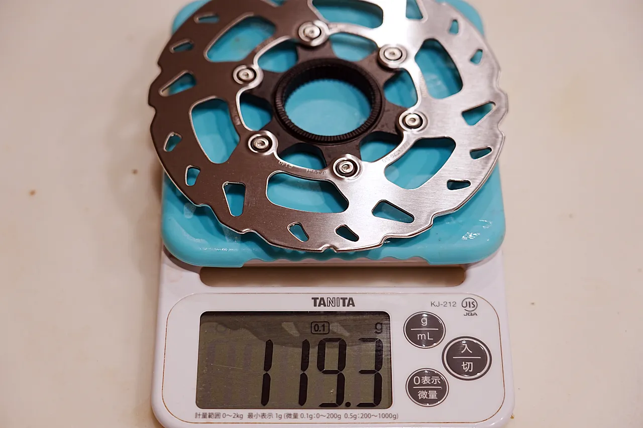 シマノの公式仕様によると、平均重量は140mmで121g、160mmで133g、180mmで159g、203mmで193gとされている。実測値を見ると、160mmサイズで132gであり、140mmでは119.3gという公称値よりも軽量な測定結果だ。